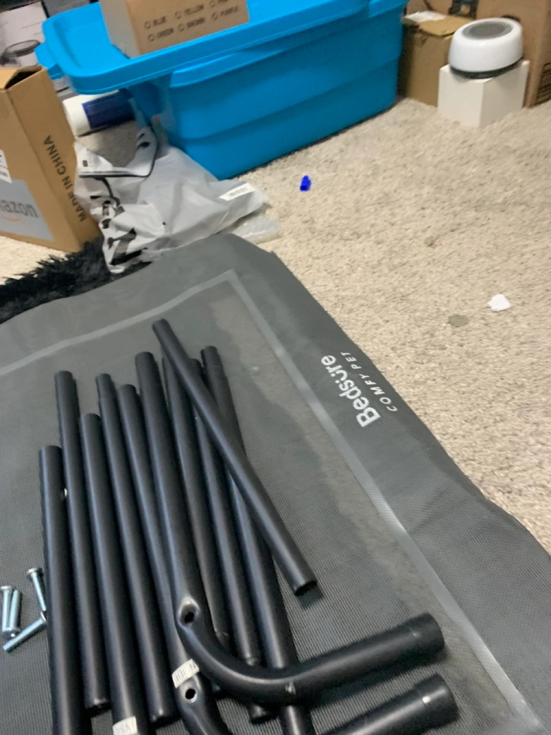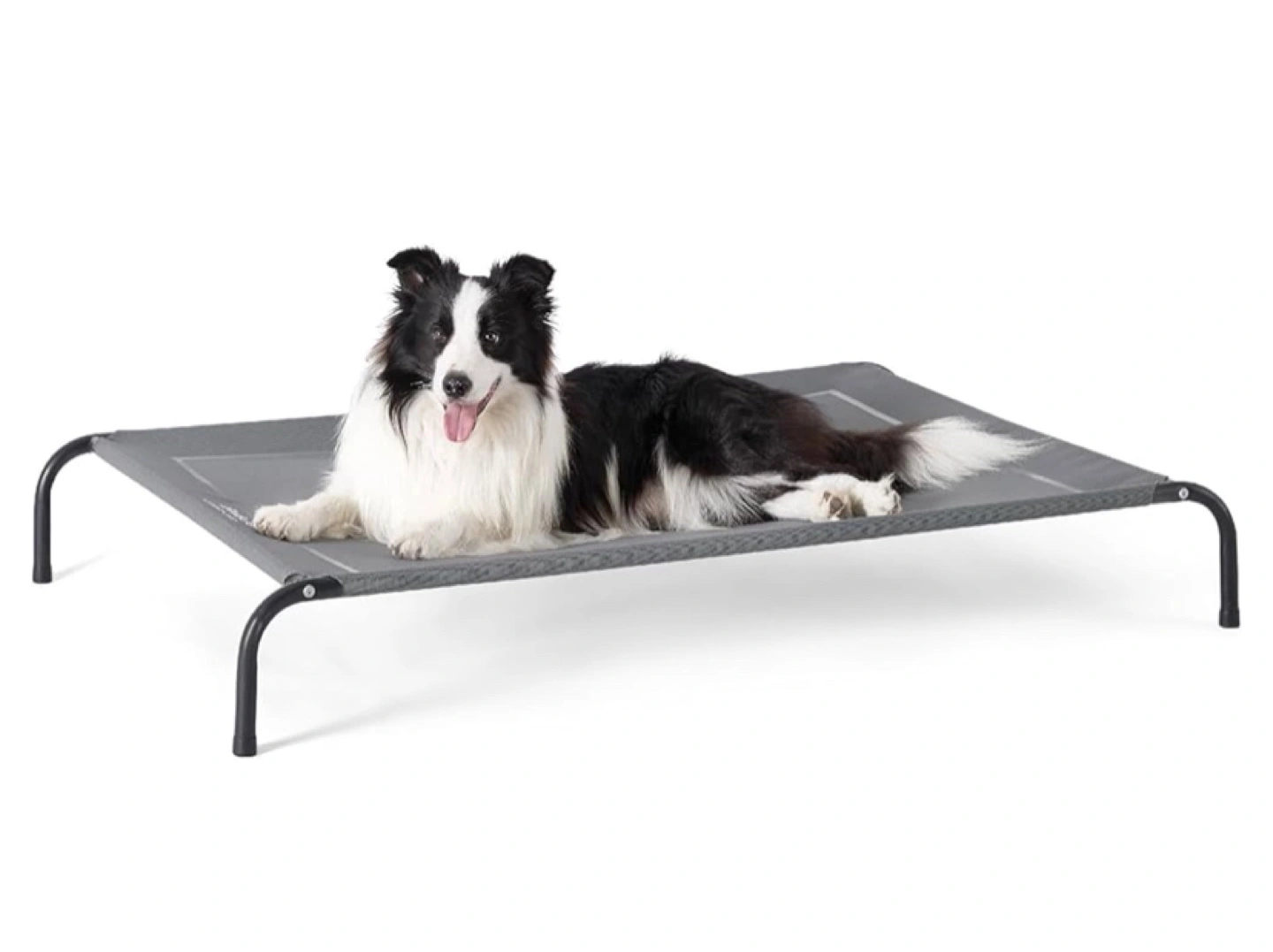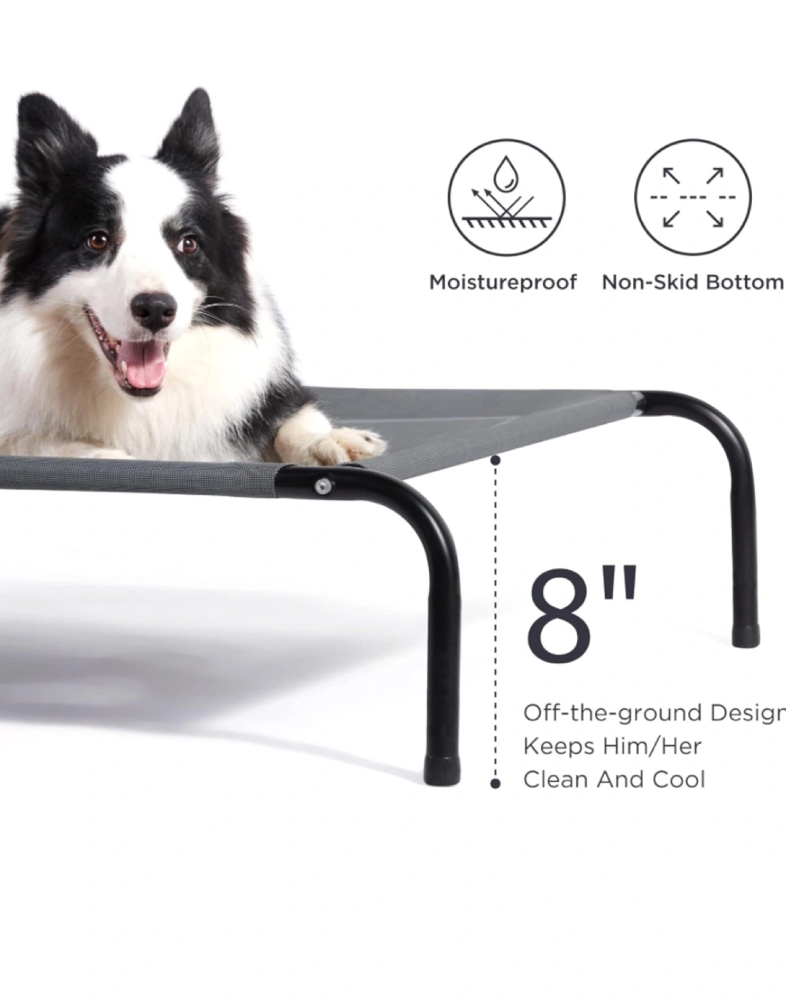 New, unassembled Beesure elevated pet bed. Grey fabric, black metal frame. Moistureproof, non-skid bottom. Durable Teslin mesh. 8" off the ground. Keeps pet clean and cool.