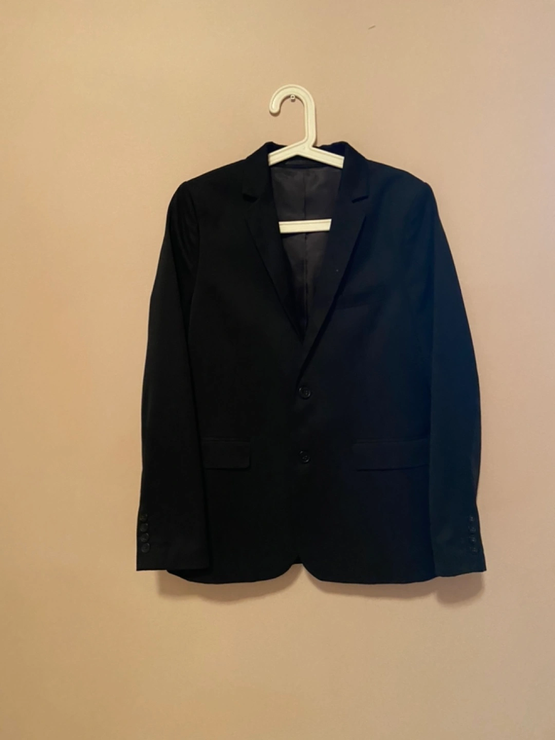 Black blazer. Two button closure. Two front pockets. Long sleeves with button cuffs.