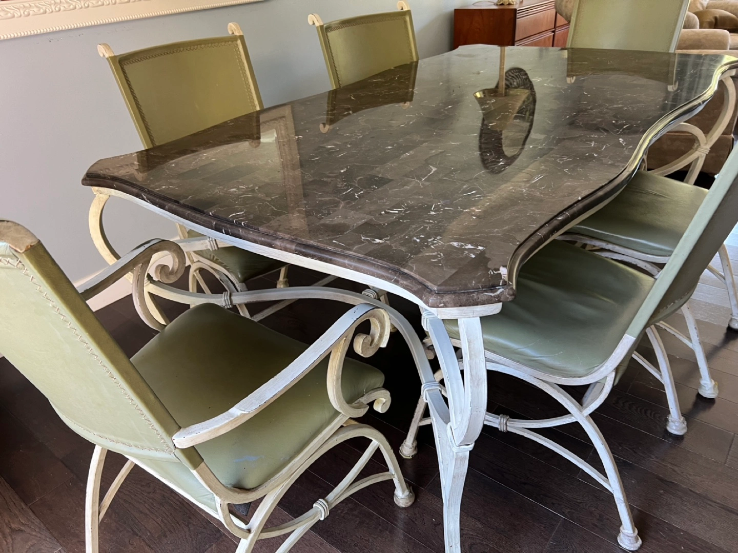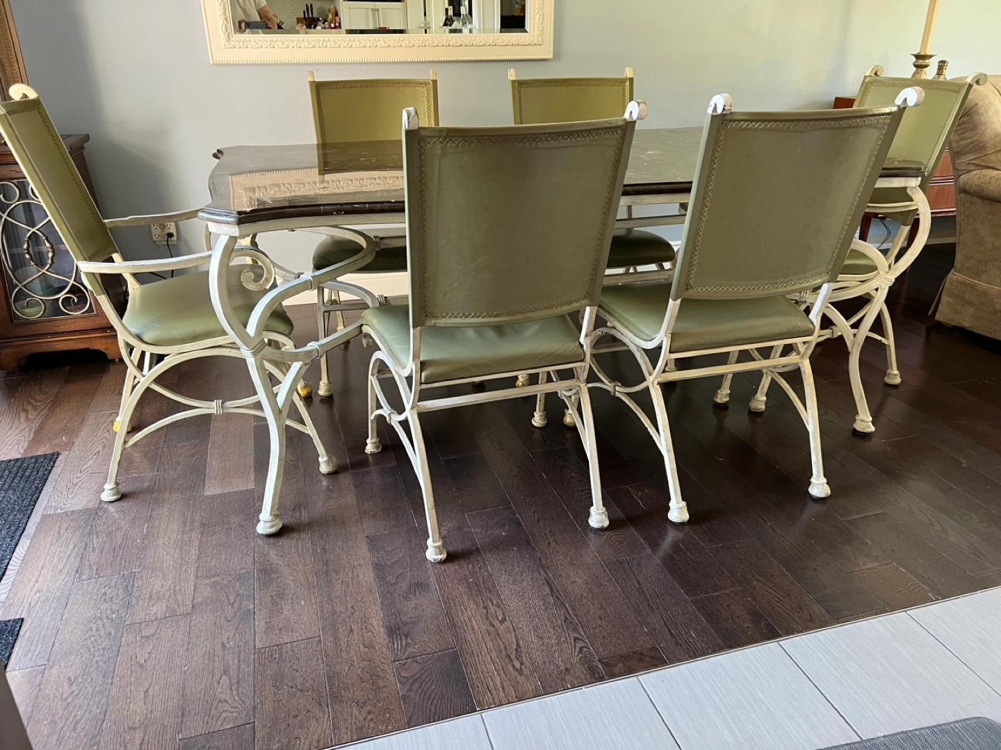 Dining table with marble top and six chairs. Cream colour wrought iron frame with beige leather seats and backs. Chairs have curved arms.