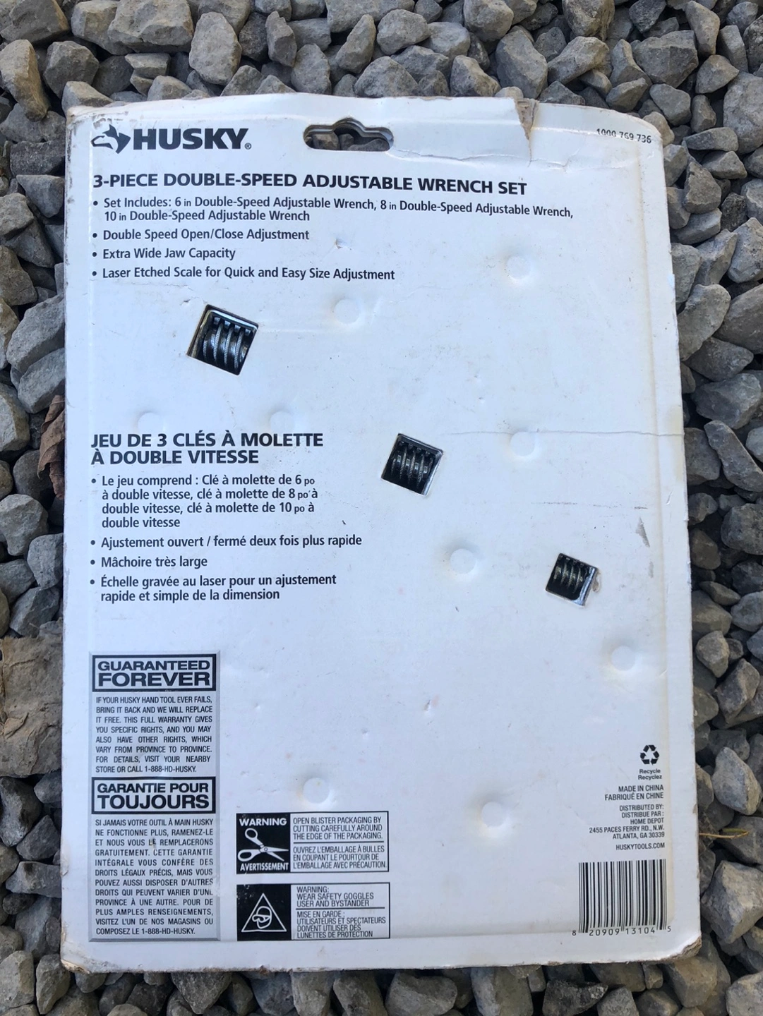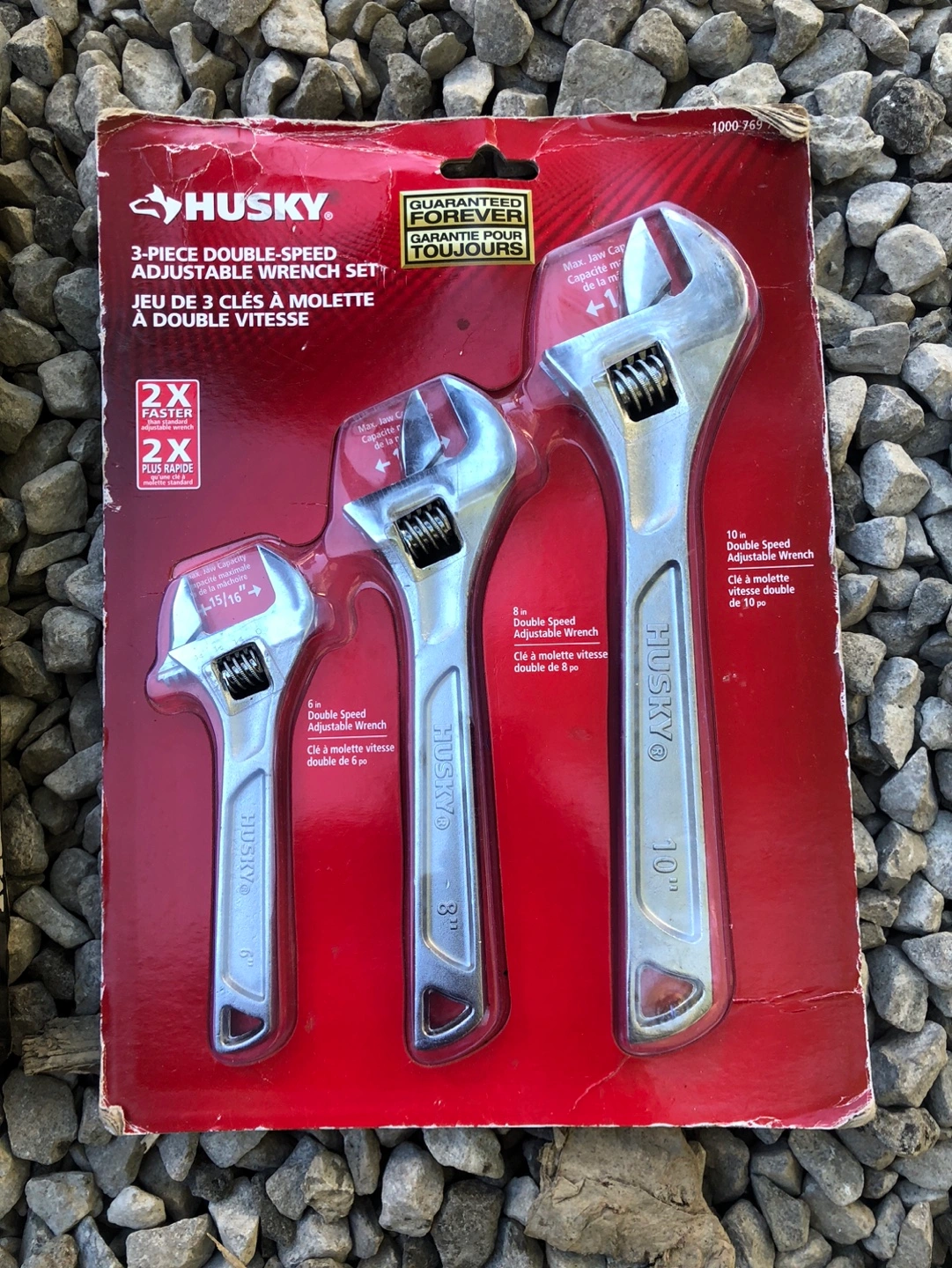 110Set includes: 6 in double-speed adjustable wrench, 8 in double-speed adjustable wrench, 10 in double-speed adjustable wrench. Double speed open/close adjustment. Extra wide jaw. Laser etched scale for quick and easy adjustment. Lifetime warranty. You can call Husky any time and get a new set. New is $25+ tax