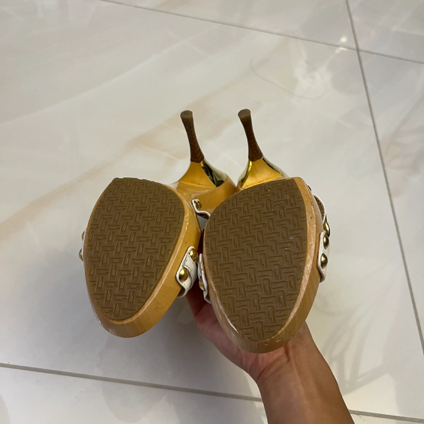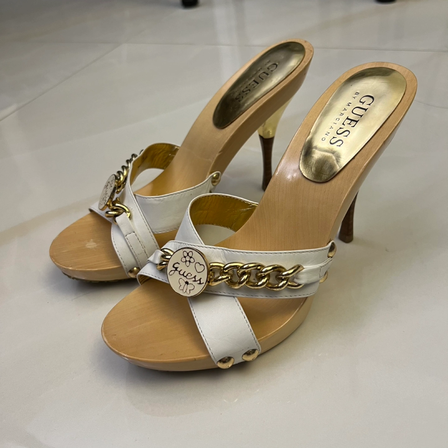 Price reflects the flaws that’s not visible when worn. This is a pair of white vegan leather platform heels with gold chain and Guess logo embellishments. Wooden platform and heel. Size 6.