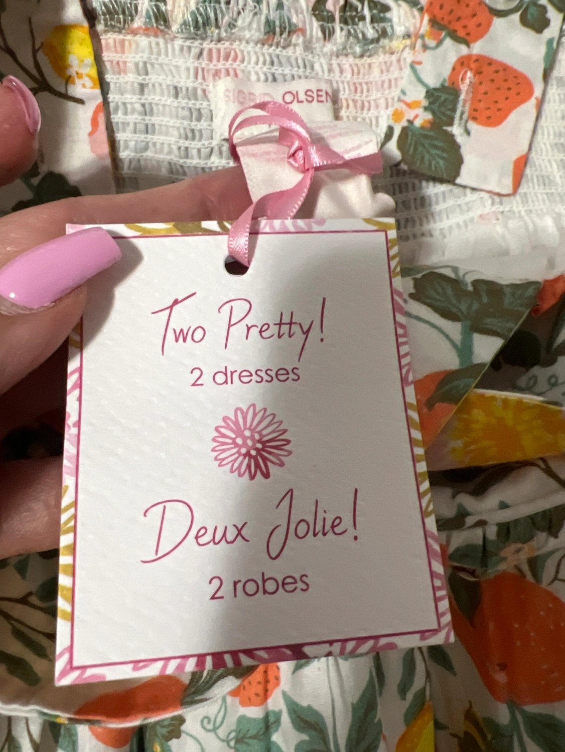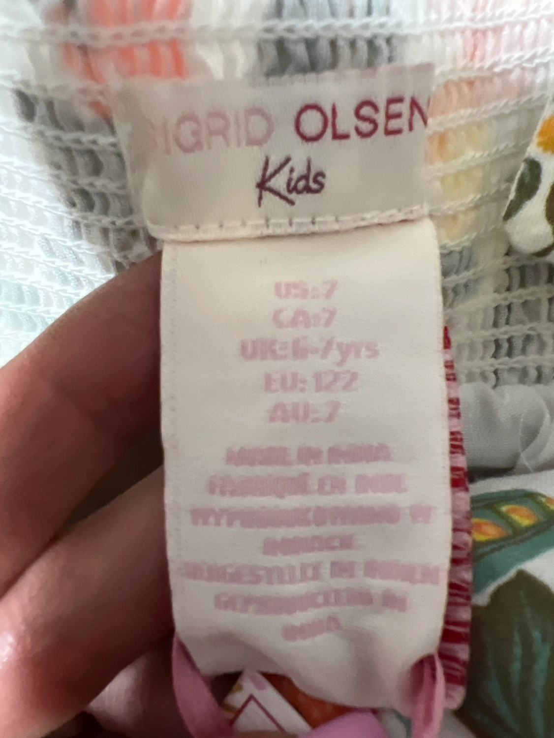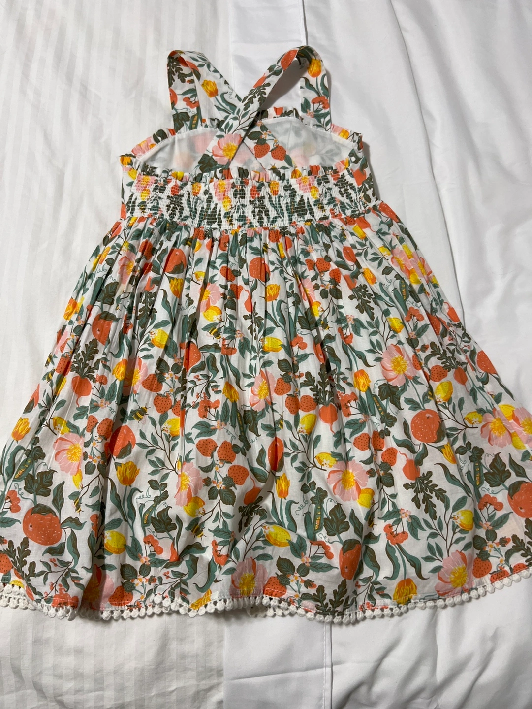 96Size 7, floral print, white base with orange, yellow, pink and green accents. White pom pom trim. Straps cross in the back.