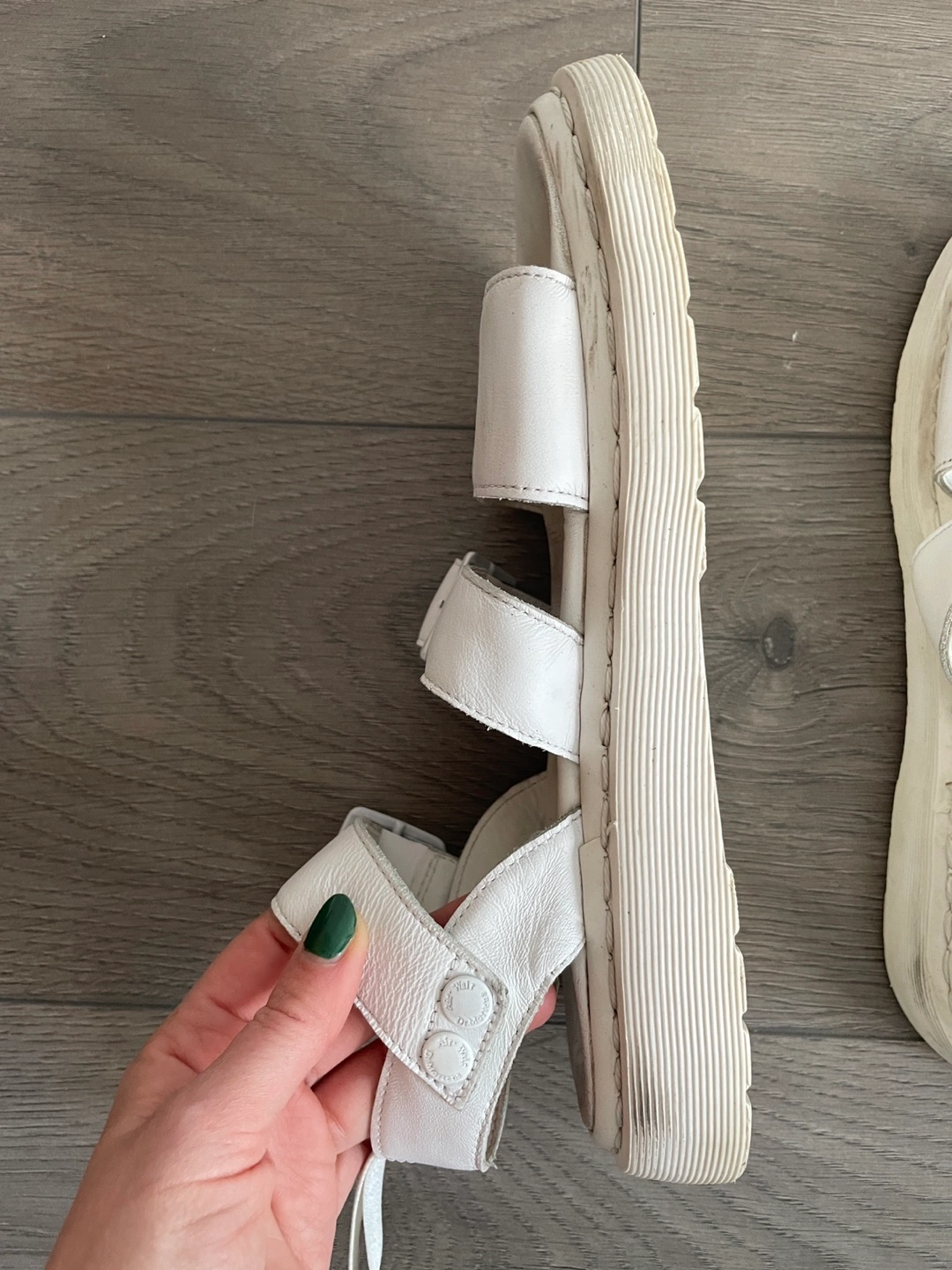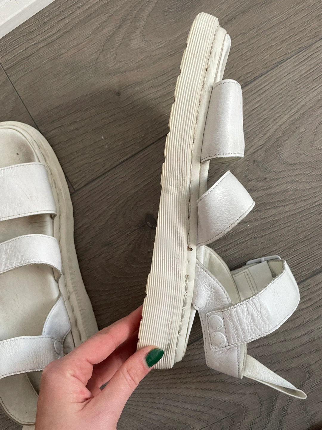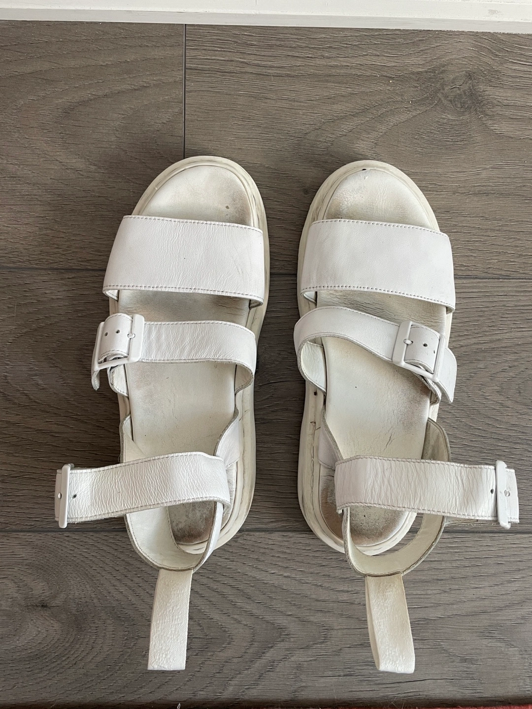 448White leather sandals with adjustable buckle straps. Thick platform sole. Worn but in good condition. Selling since they’re too large for me - size isn’t listed but likely womens 9 since my womens 8 fit me. Pickup near Woodbine Station only. First come first serve.