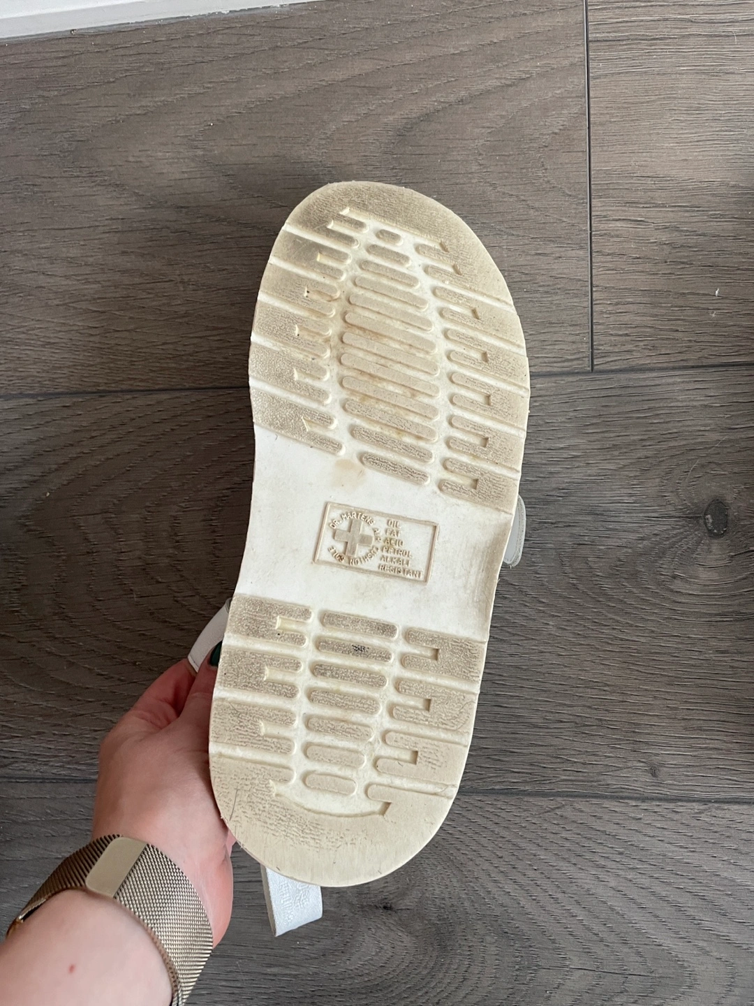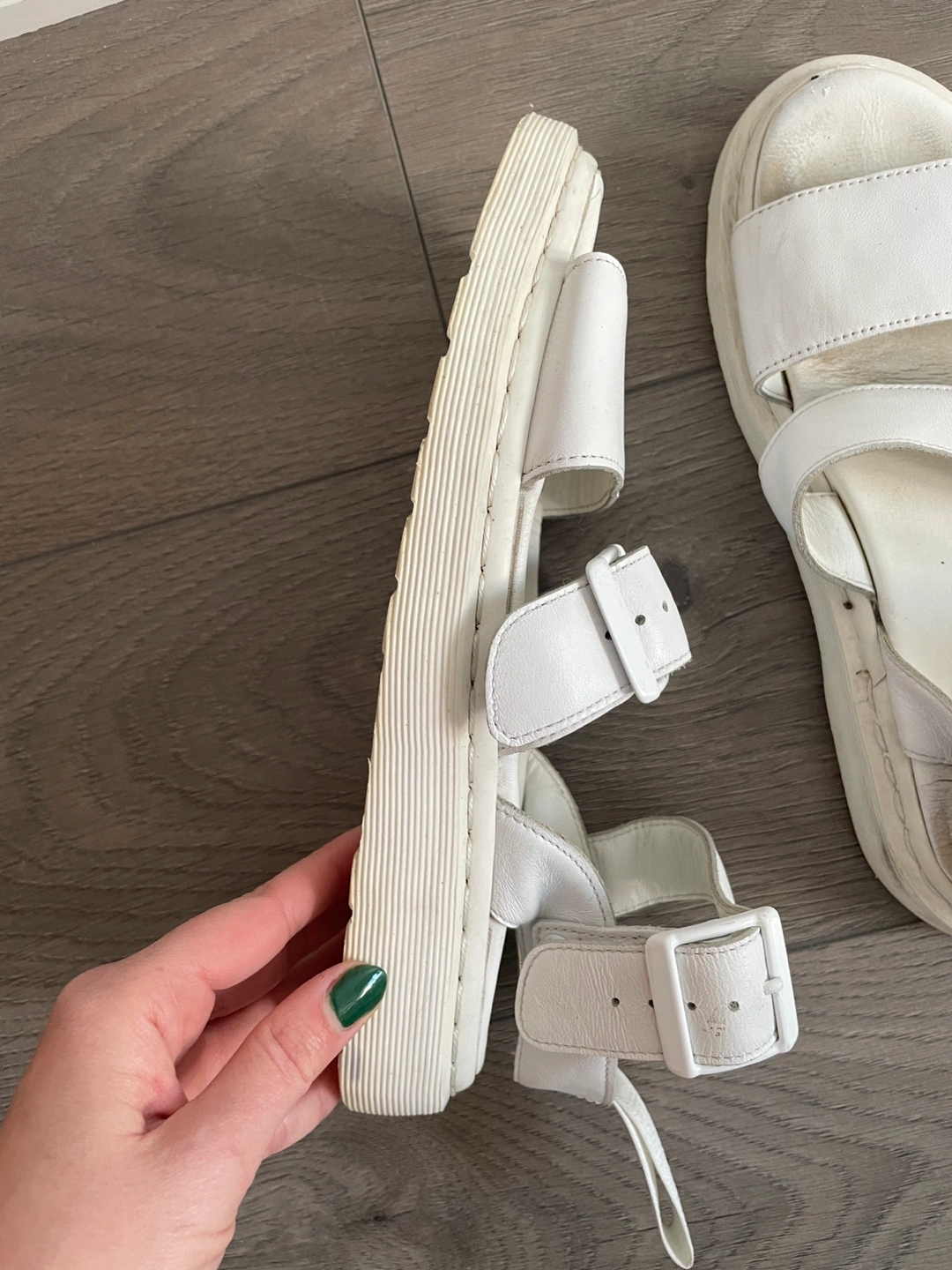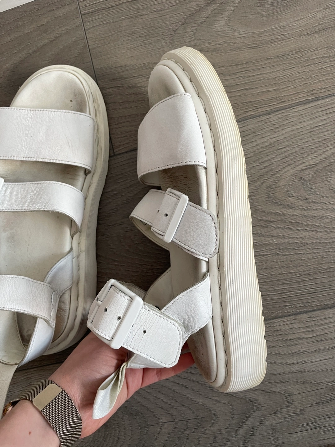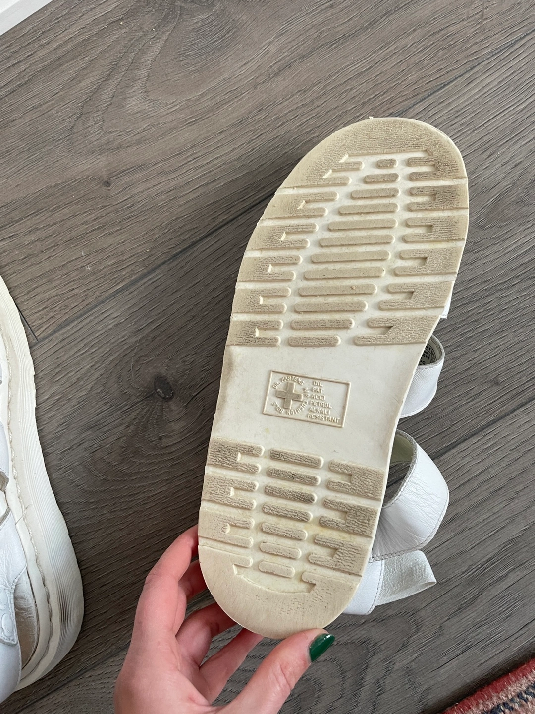 448White leather sandals with adjustable buckle straps. Thick platform sole. Worn but in good condition. Selling since they’re too large for me - size isn’t listed but likely womens 9 since my womens 8 fit me. Pickup near Woodbine Station only. First come first serve.