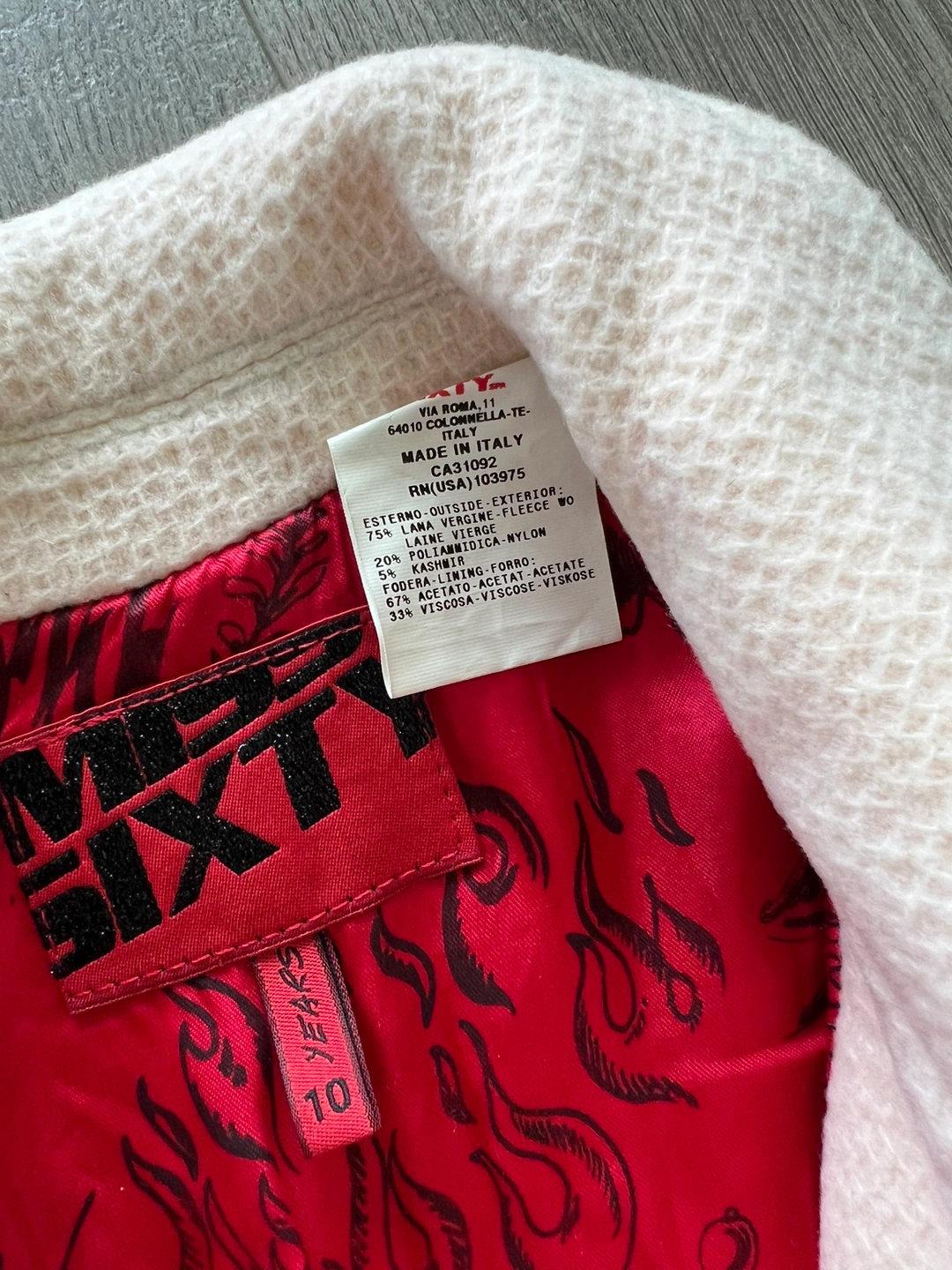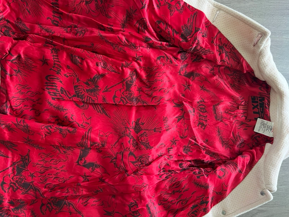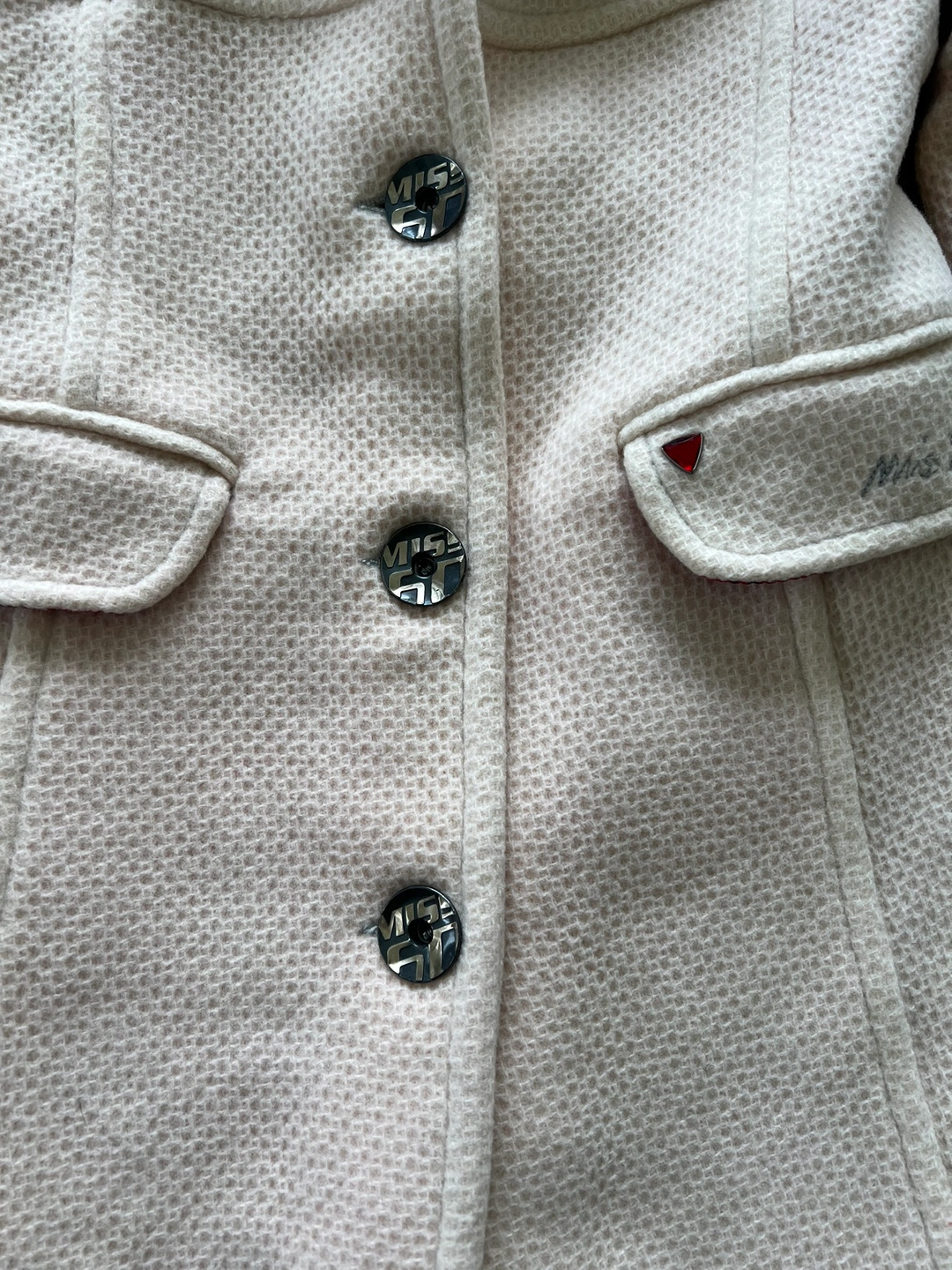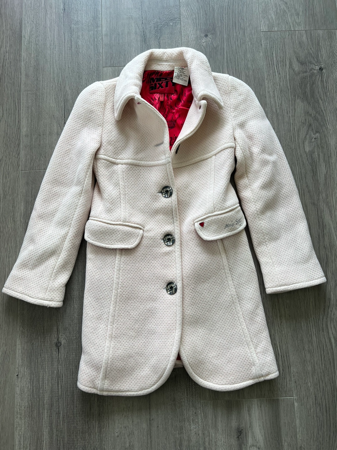 Off White coat / Jacket with red lining, silver buttons, and a small pocket on the left side with a red crystal. Classic piece for fall.