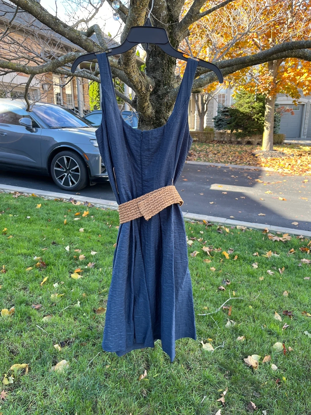 Selling a Nine West dress in navy blue! It's in great condition and would be a lovely addition to your wardrobe. The dress has a woven belt detail that adds a nice touch.