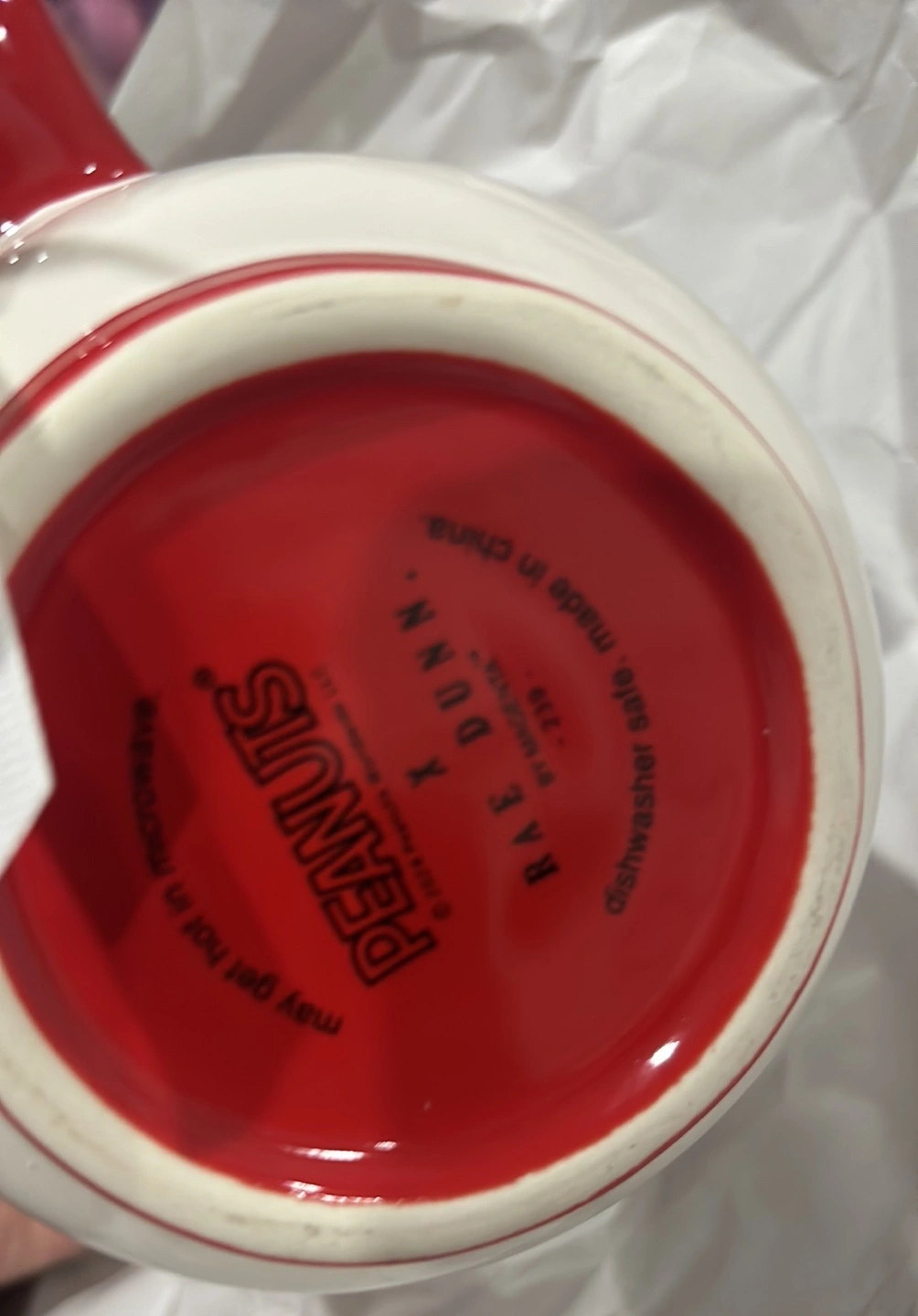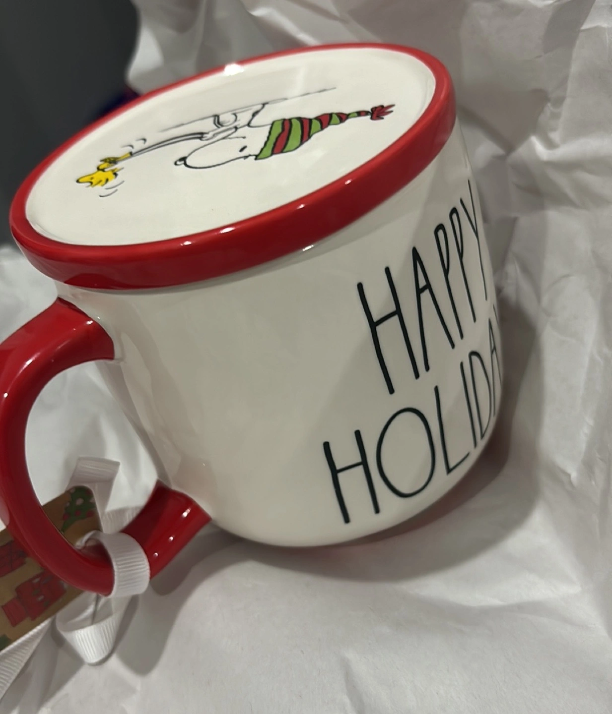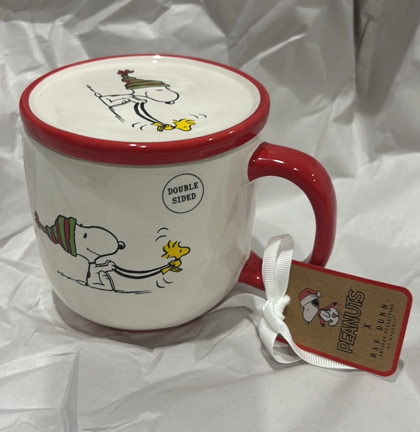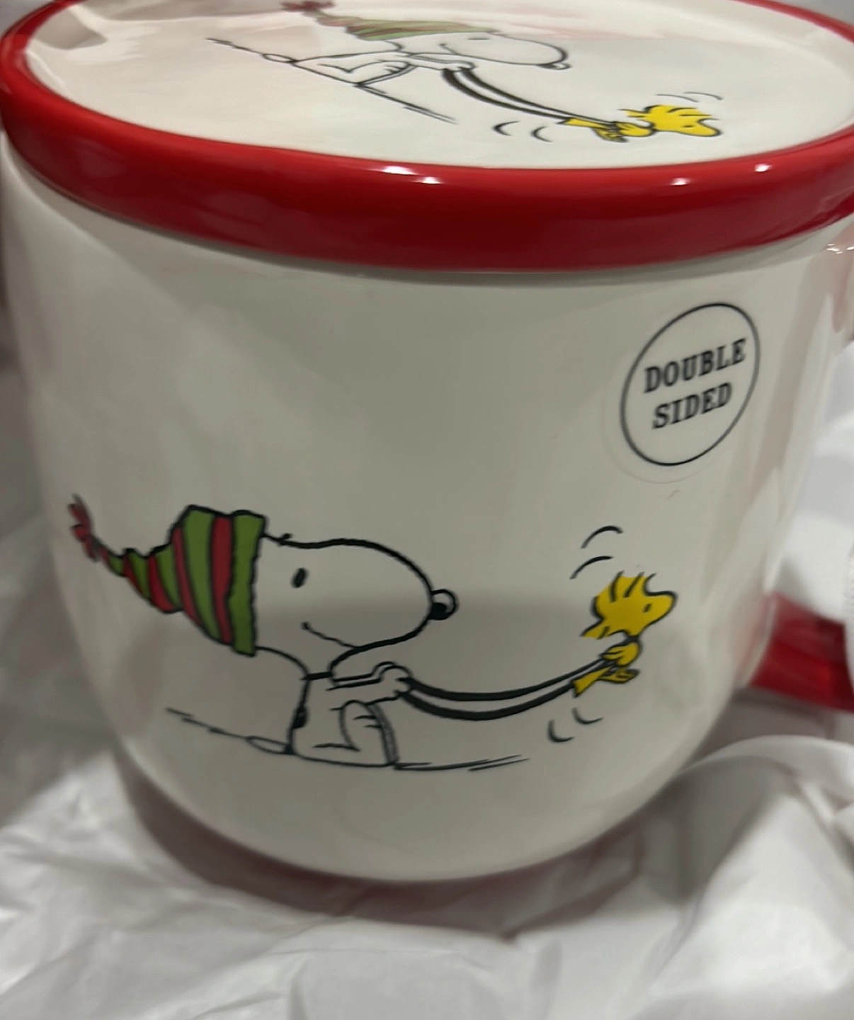 Double-sided mug with lid. Features Snoopy and Woodstock. Red and white colour scheme.