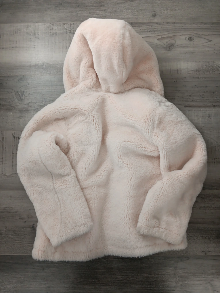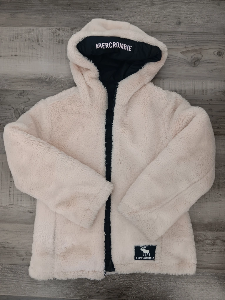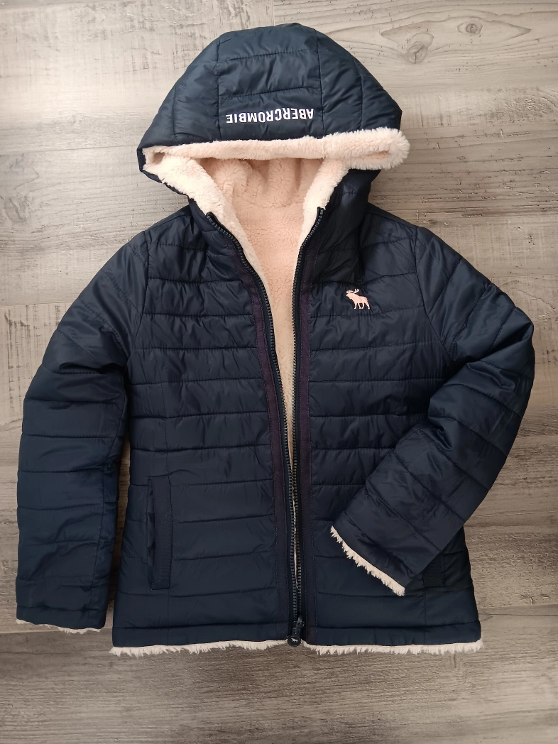 Reversible jacket with a faux fur side and a puffer side. Has a hood and pockets on both sides. Navy and pink. Kids size large.