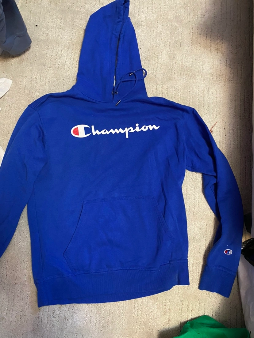 1000+Blue Champion hoodie with white logo. Size M. Good condition.