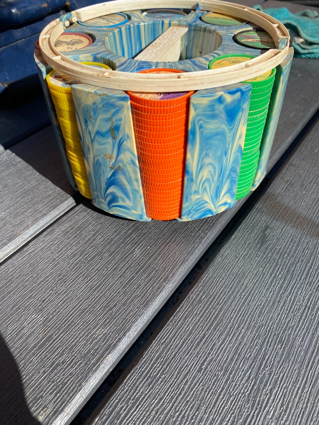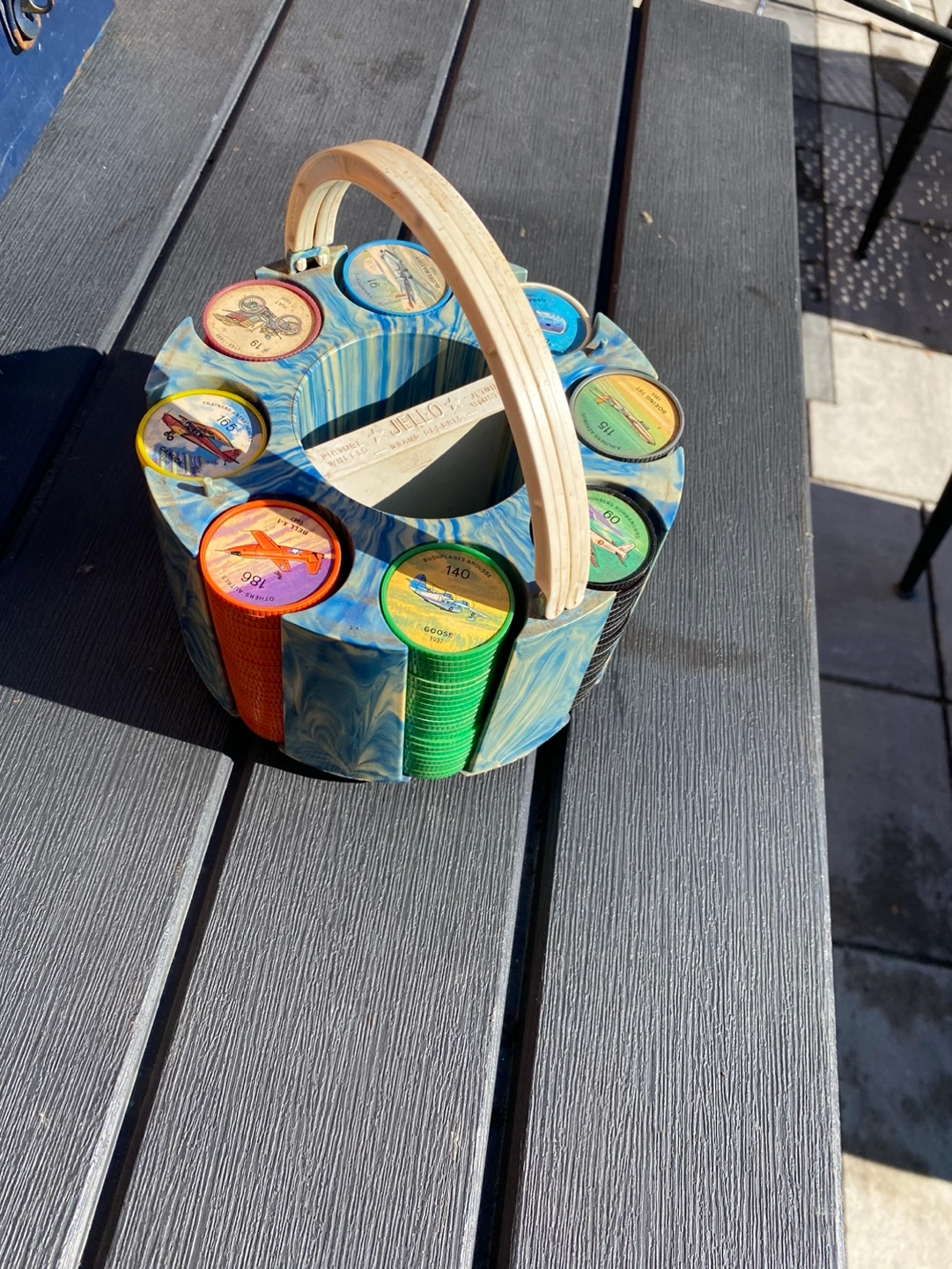 Vintage Jello Chip Set with a handle. Contains chips with different coloured plastic cases and images of various airplanes. Includes a storage case for the chips.