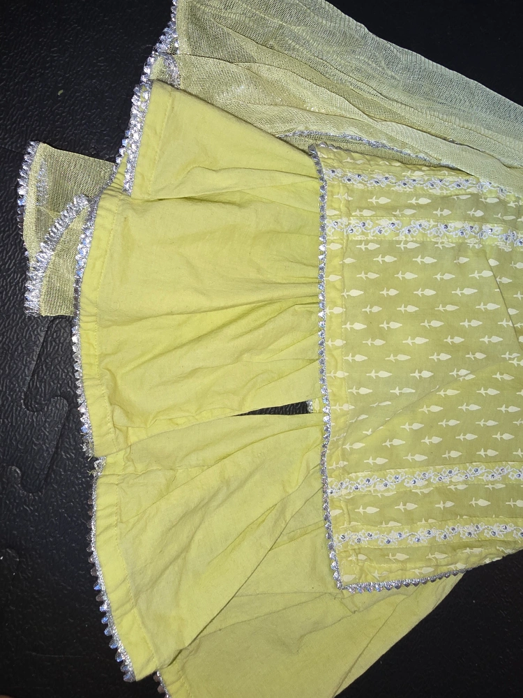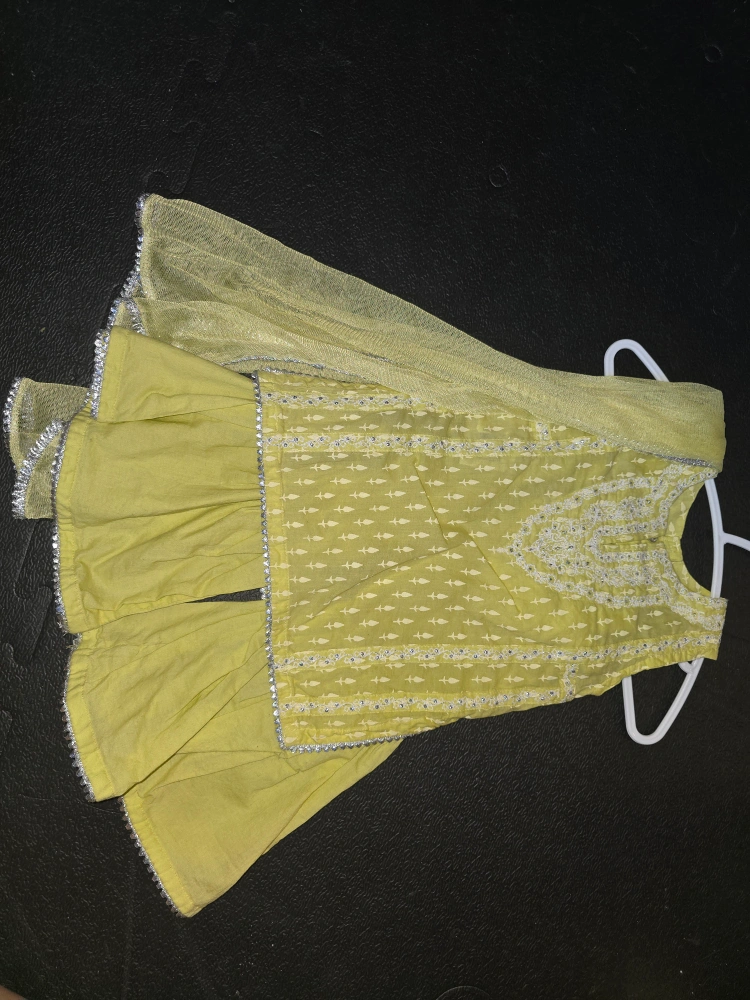 Yellow salwar kameez suit. Includes a top, pants, and dupatta. Has beautiful embroidery in silver color. Size: 0-3months if baby petite can fit 6month old