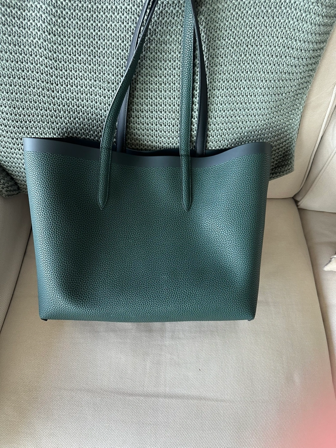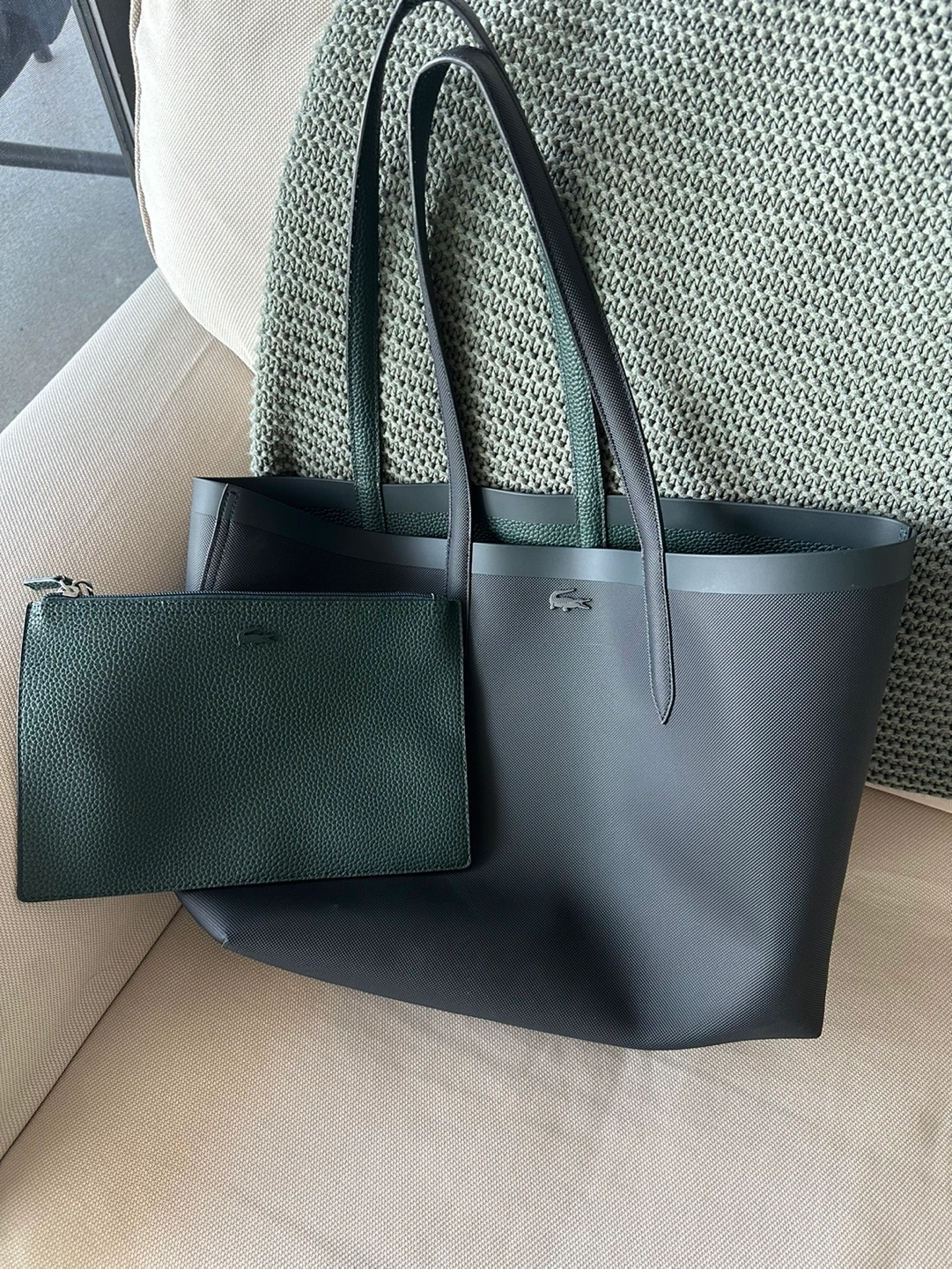 Original Lacoste Women Tote Bag; reversible Green/Black color big enough to hold computers, water bottles, purses, and even jackets at once. Bought before pandemic (2019).