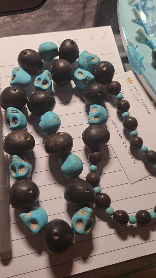 Blue and black bead necklace with skull-shaped beads. A great conversation starter or costume accessory!