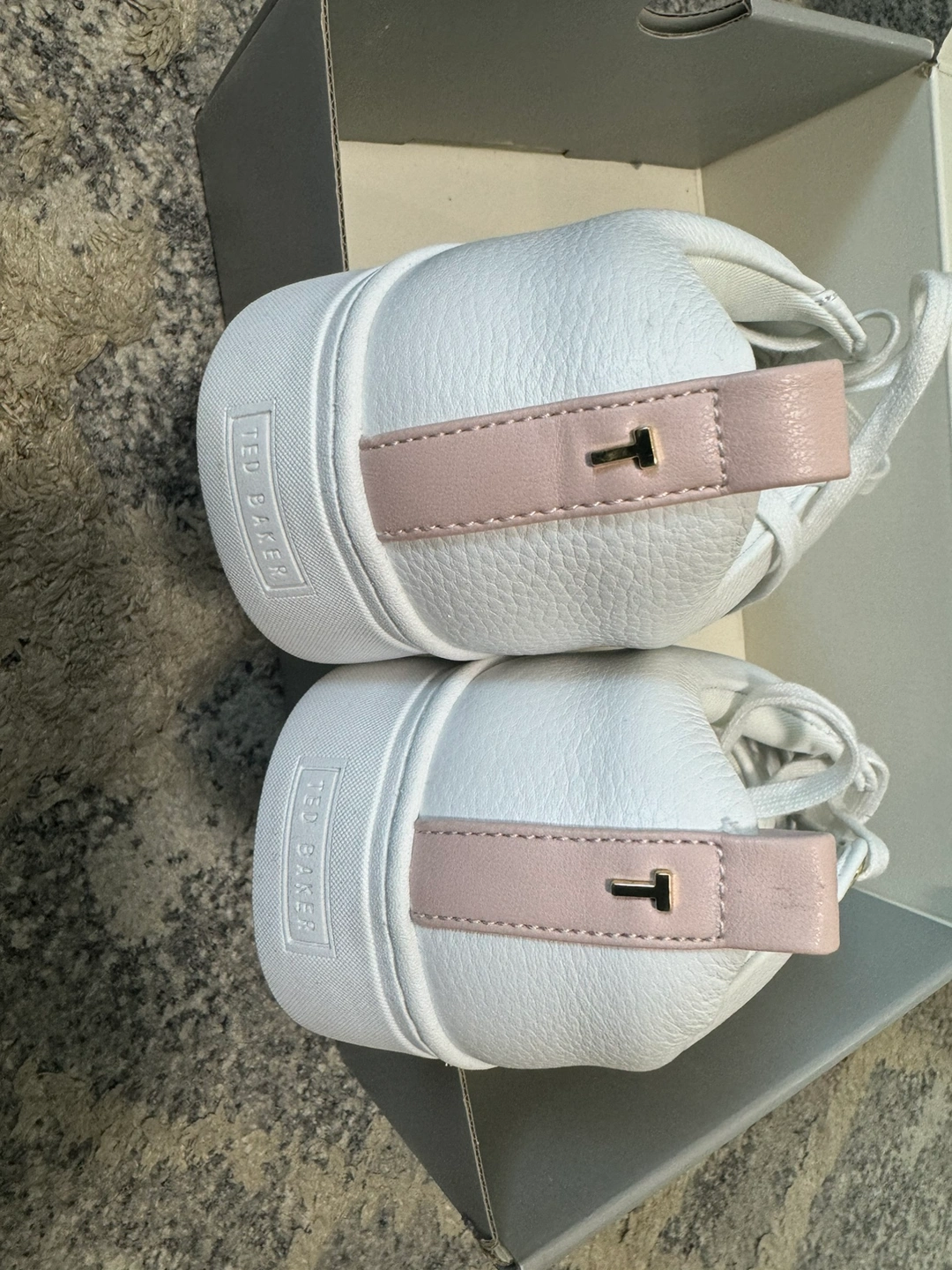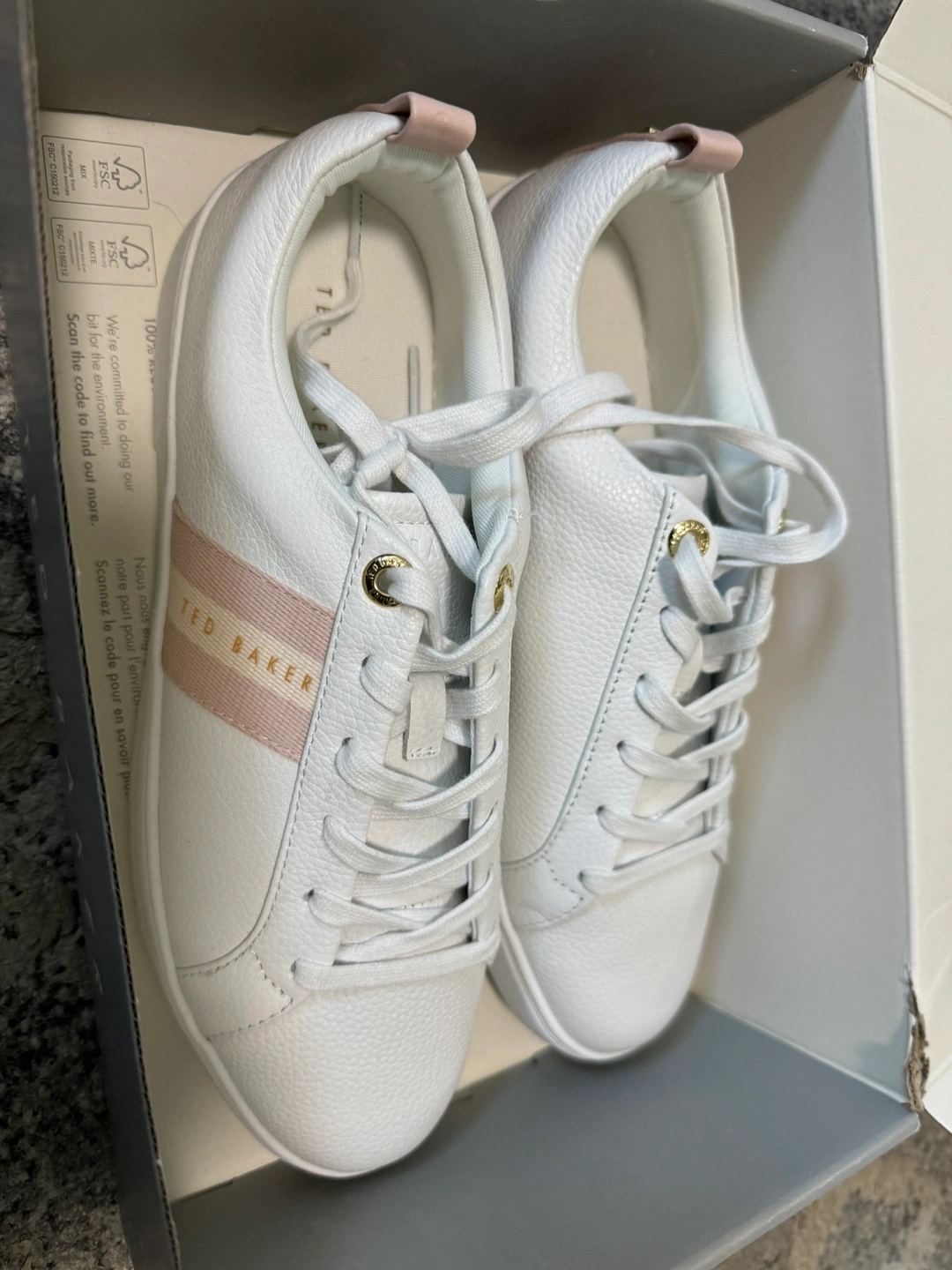 White leather sneakers with pink accents. Lace-up closure. Comes in original box.