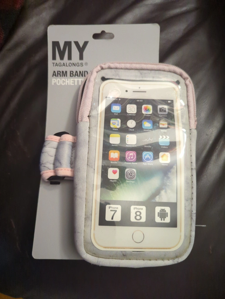 Arm band for phone. Fits most sizes of smartphones and has a clear front to operate your phone. Adjustable velcro strap fits most upper arms.