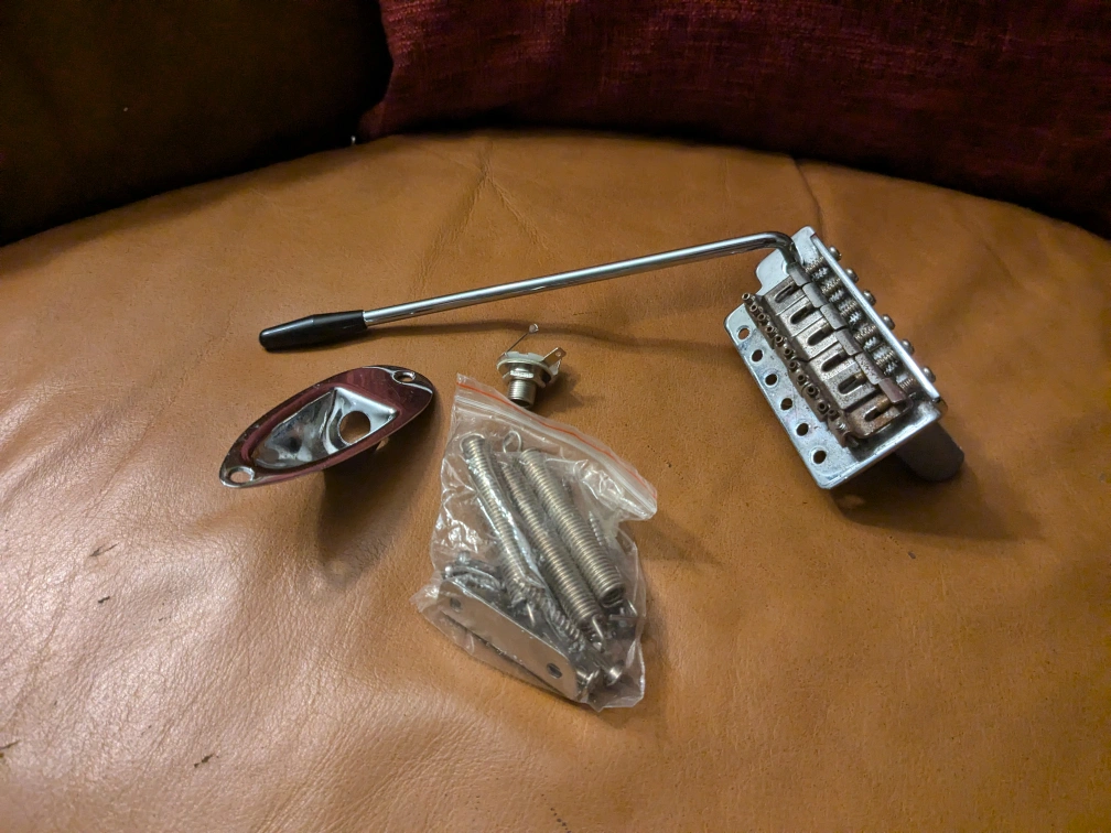 Swapped out from my Fender Stratocaster. Includes everything shown here. Bridge shows slight rust / discolouration. All official hardware.