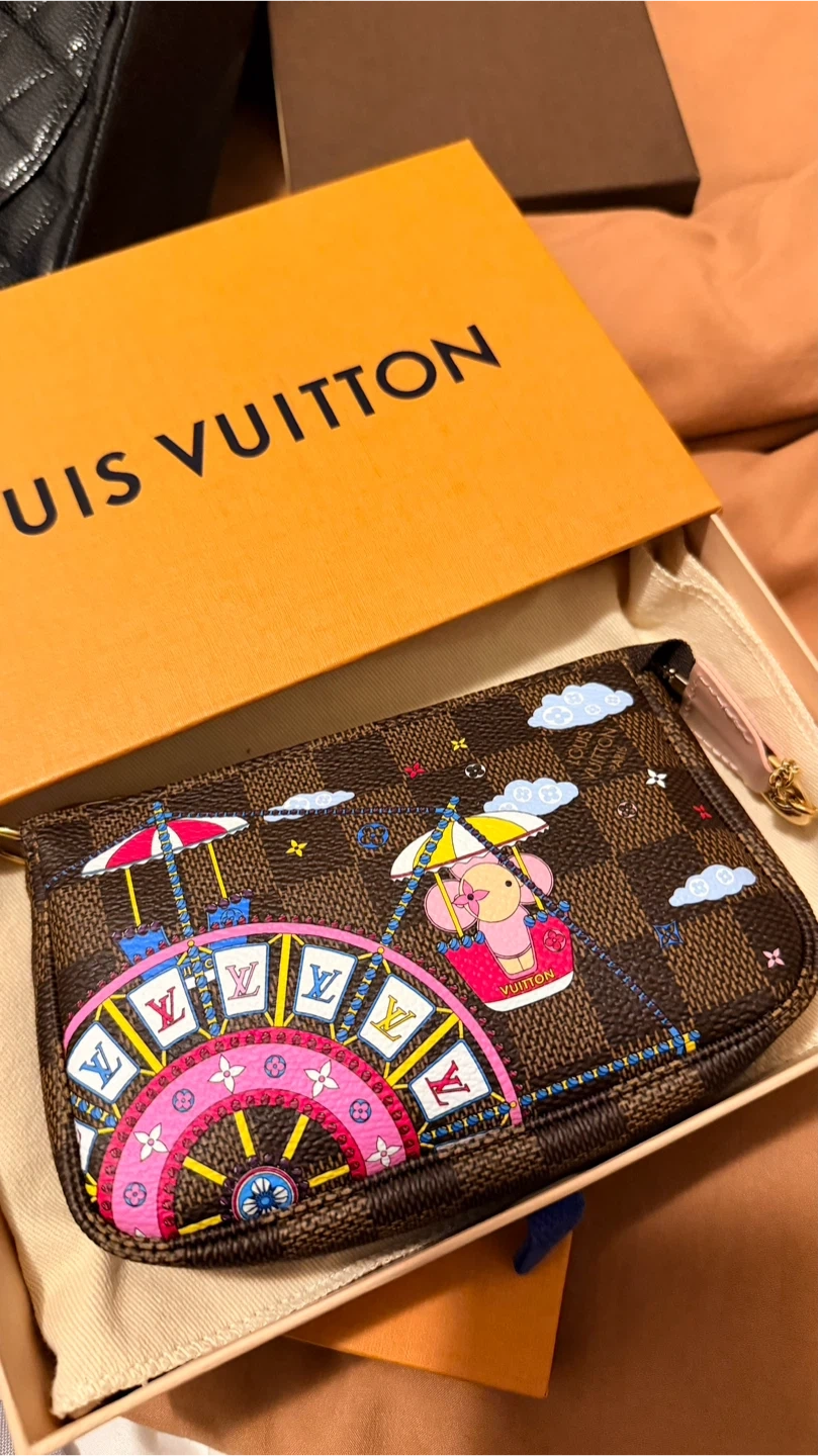 This is a Louis Vuitton pouch featuring a playful Ferris wheel and animal print on their signature checkered canvas. It comes in its original box, perfect for storing small essentials.