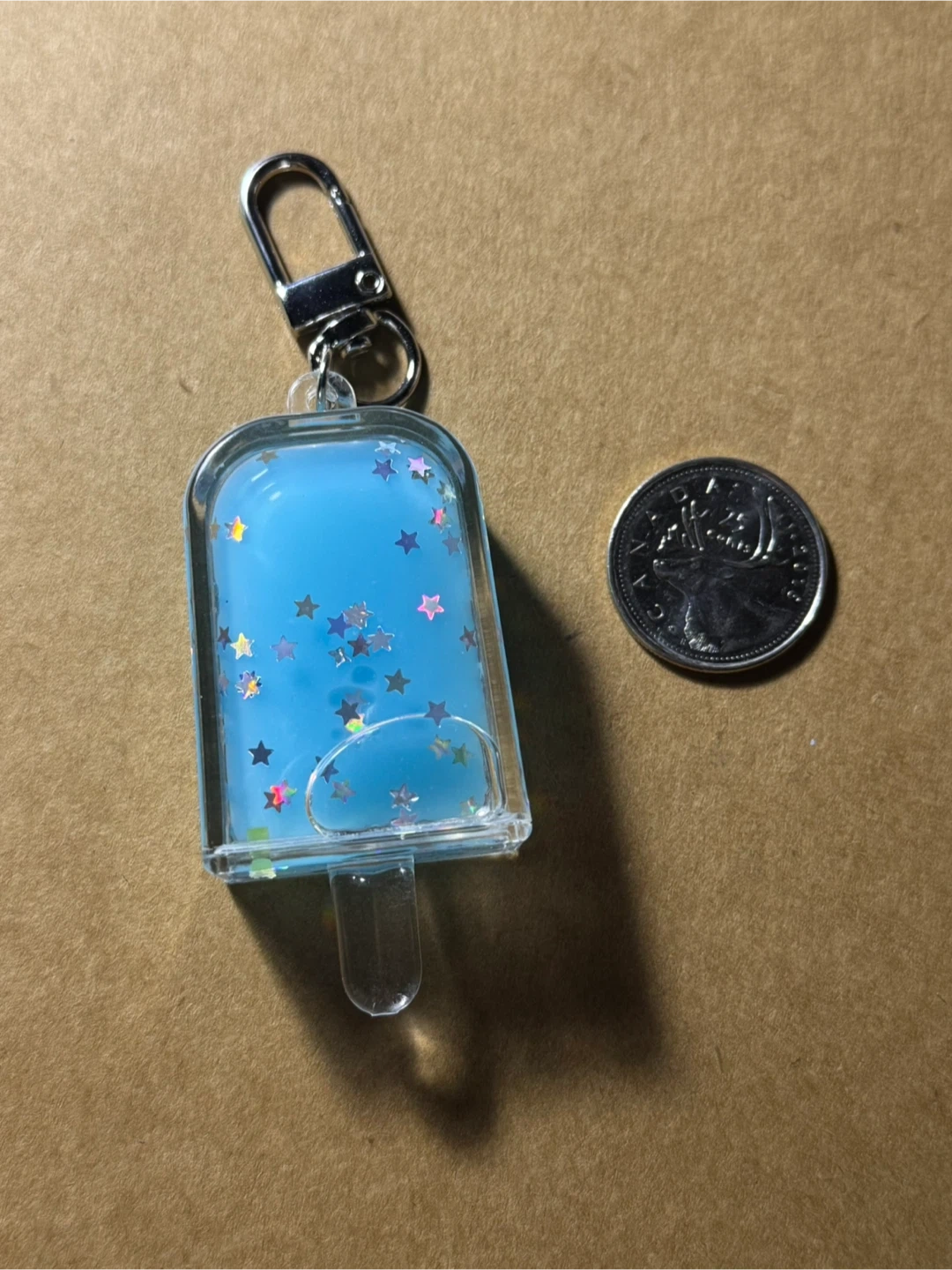 This cute keychain is shaped like a popsicle with a blue liquid centre filled with star-shaped glitter. It features a silver-tone clasp for easy attachment. The clear plastic casing has a colourful, shimmery interior.