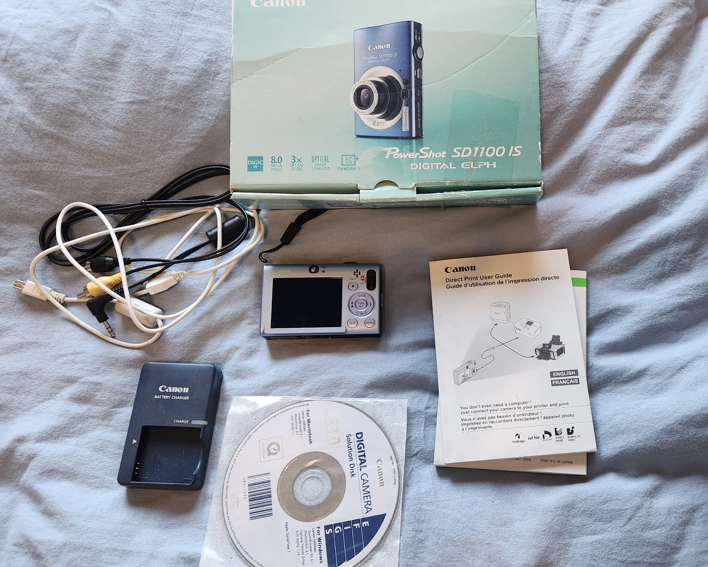 This is a blue Canon PowerShot SD1100 IS Digital ELPH camera with 8.0 megapixels and 3x optical zoom. It comes with its original box, user guide, battery charger, cables, and software disc. It's in good condition and ready for new photos!