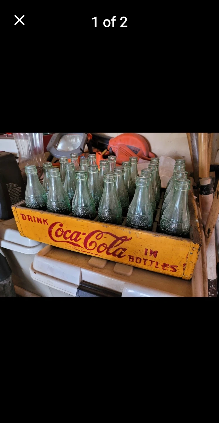 Vintage Coca-Cola glass bottles are sold in a wooden crate. The crate has the "Drink Coca-Cola in Bottles" text on the side. These bottles are great for collectors or for rustic decor.