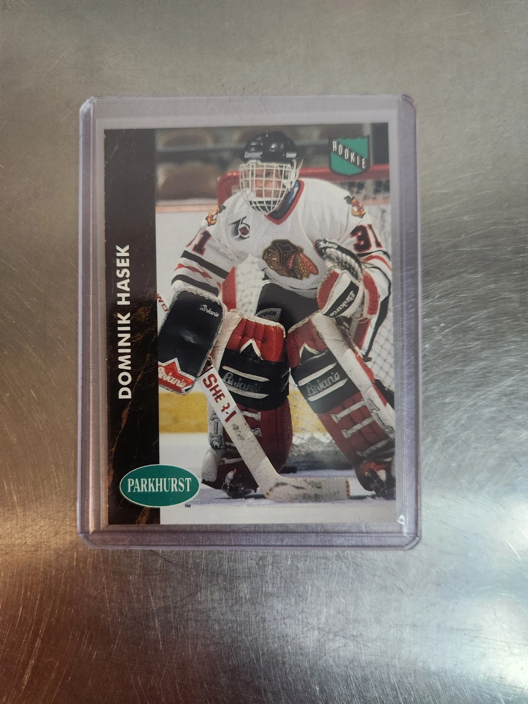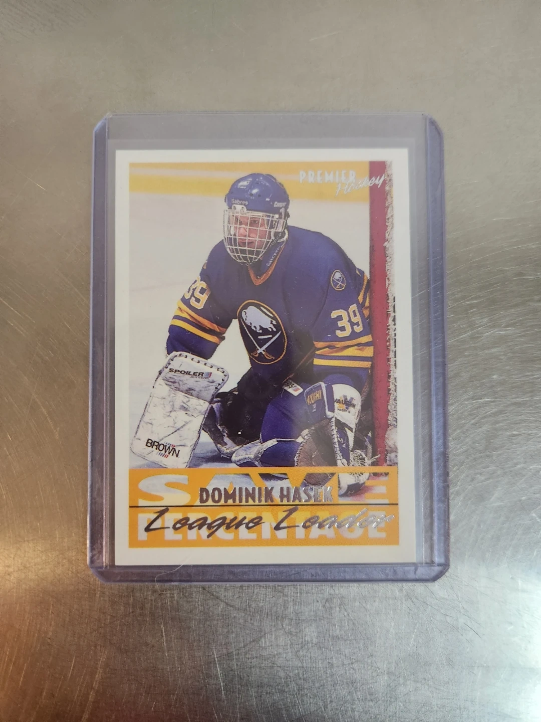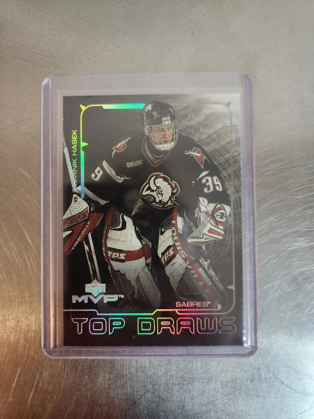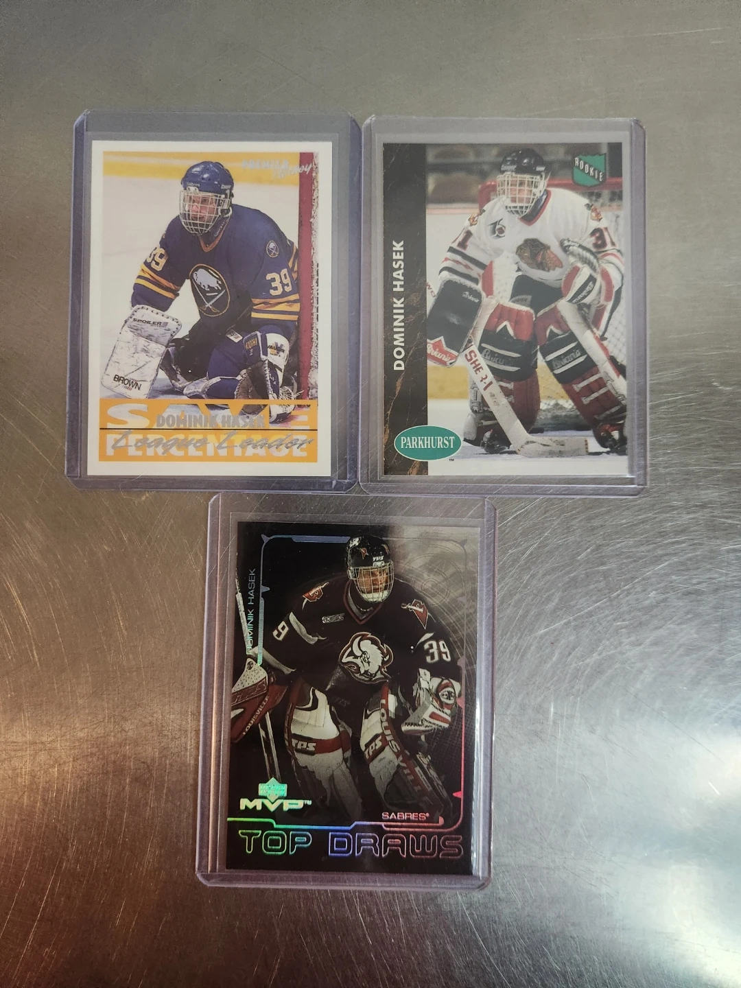 Three Dominik Hasek hockey cards. Includes a Parkhurst card, a Premier Hockey card, and a Top Draws MVP card. Cards are in protective sleeves.