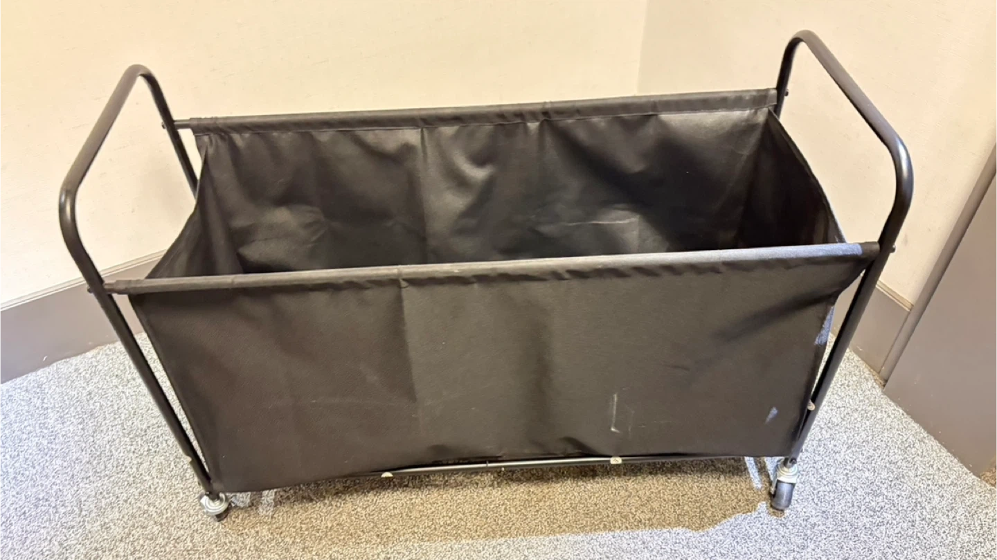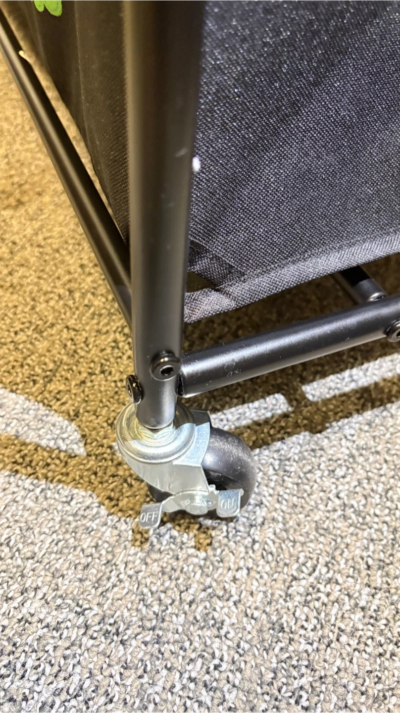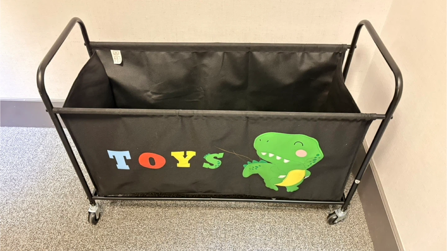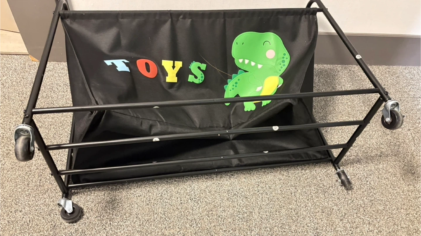 Black fabric storage cart with a cute dinosaur graphic and 'TOYS' lettering. It's got wheels for easy moving around! Perfect for a kid's room or play area.