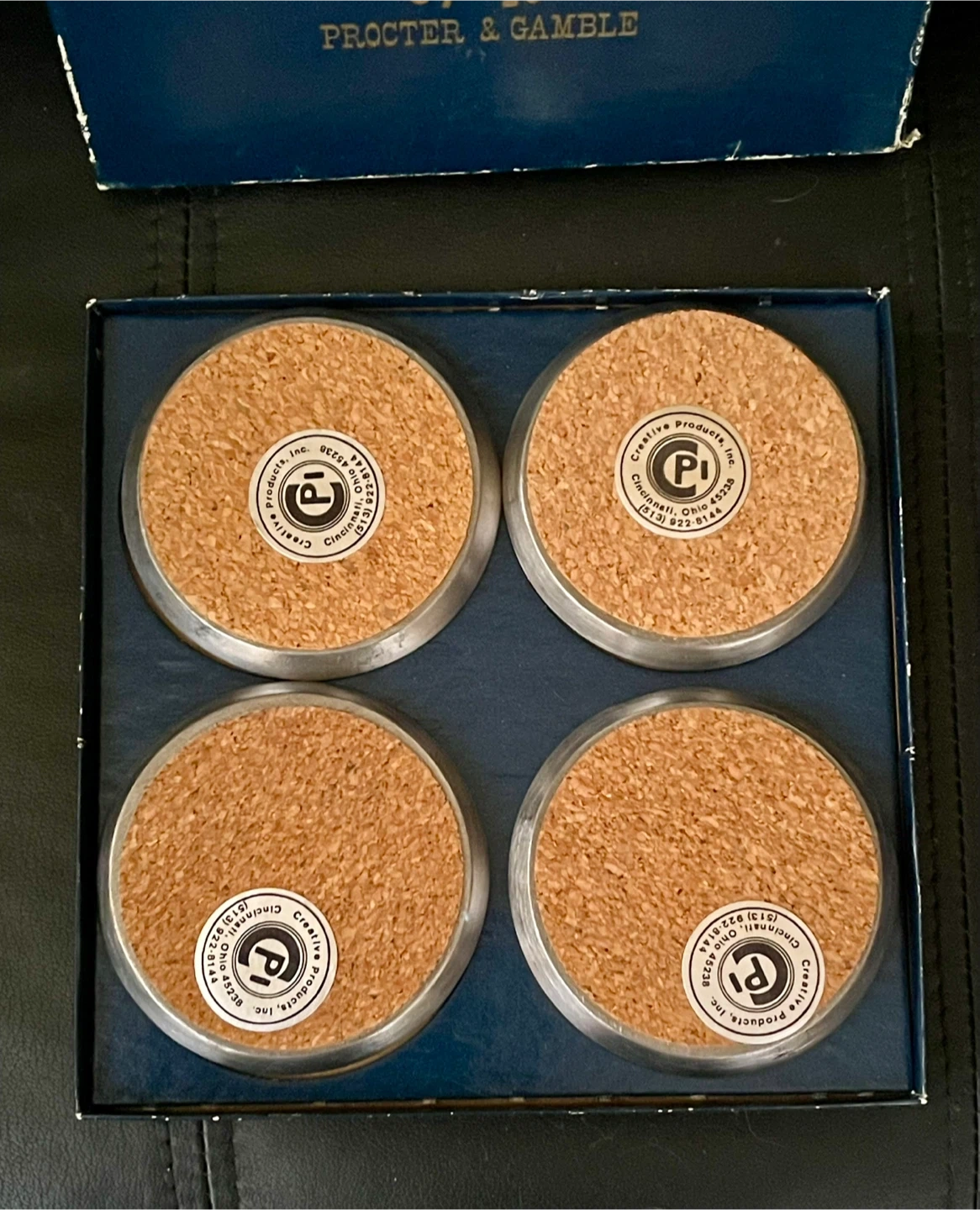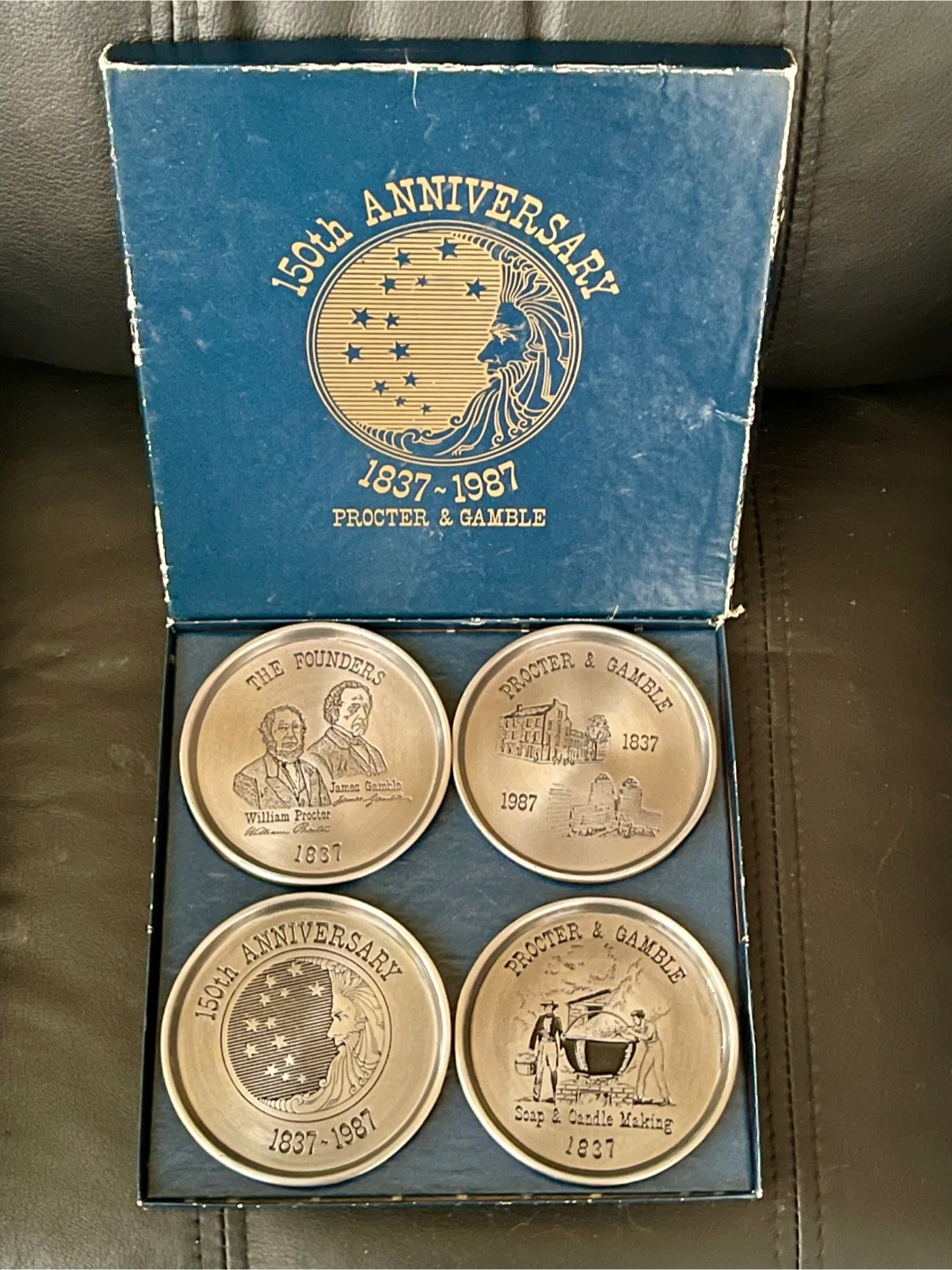 This is a set of four commemorative pewter coasters celebrating Procter & Gamble's 150th anniversary. Each coaster features a unique embossed design related to the company's history. The coasters are new and unused. The original box, which has some shelf wear is included, making it a great collector's item!