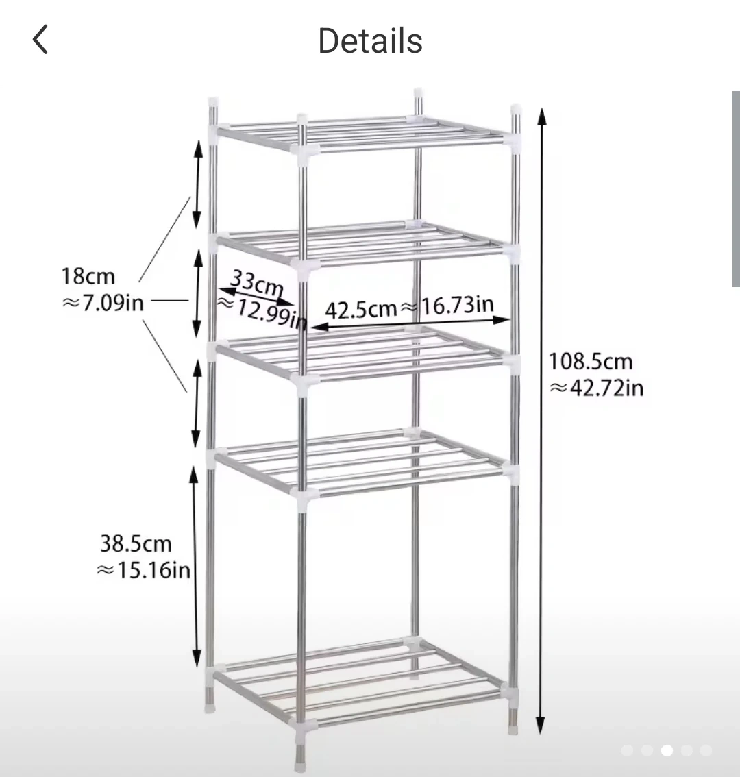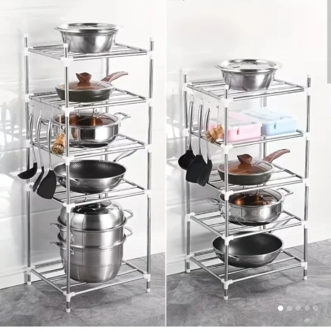 This is a 5-tier kitchen storage rack, suitable for organizing pots, pans, and other kitchenware. It's made of stainless steel with white plastic connectors. Dimensions are 108.5cm high, 42.5cm wide, and 33cm deep.