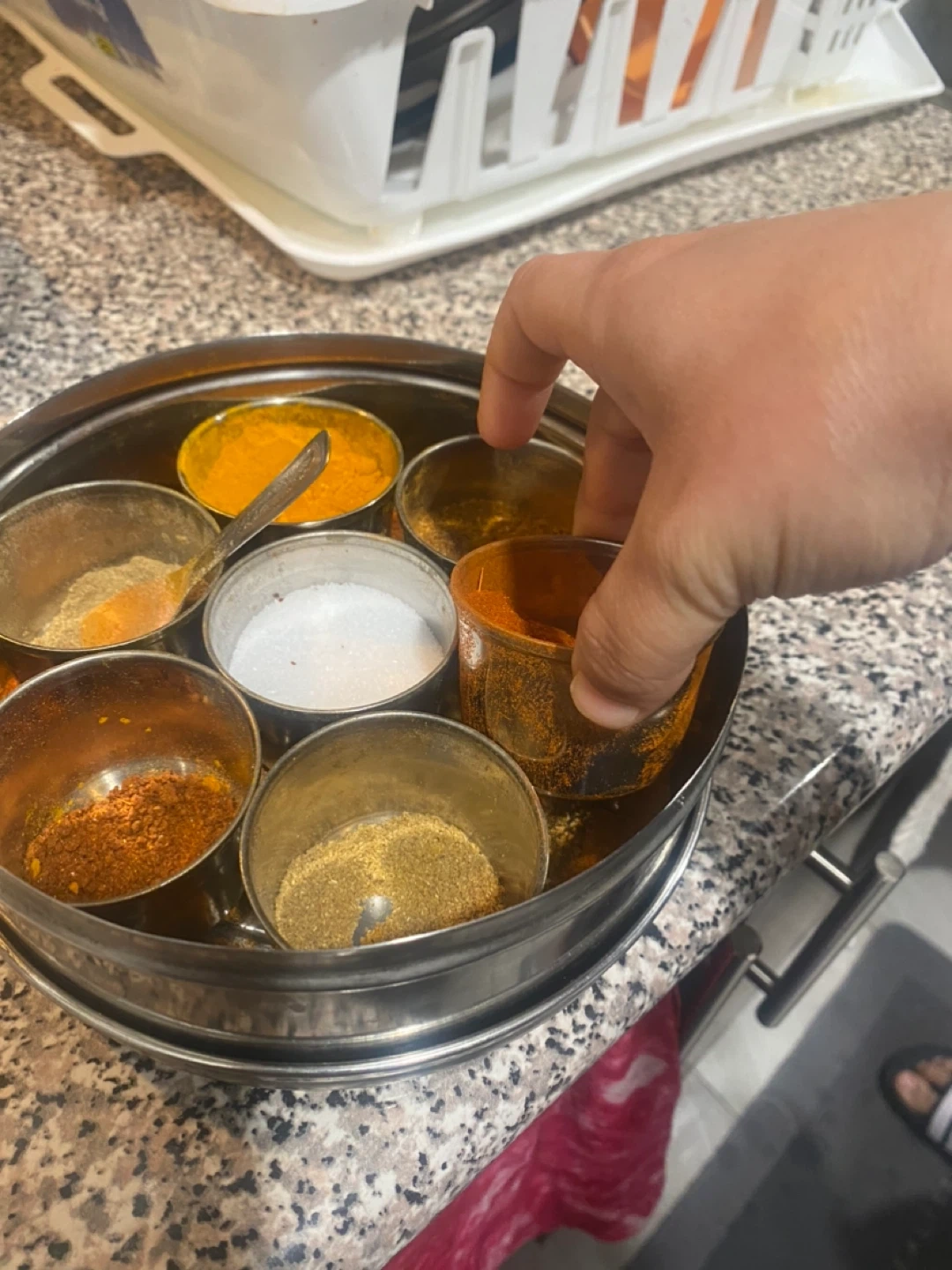 This is a classic stainless steel spice box that's perfect for organizing your favourite ground spices. It comes with seven individual compartments and a small spoon. The tight-fitting lid keeps your spices fresh! It's great for any kitchen looking to streamline their spice collection.