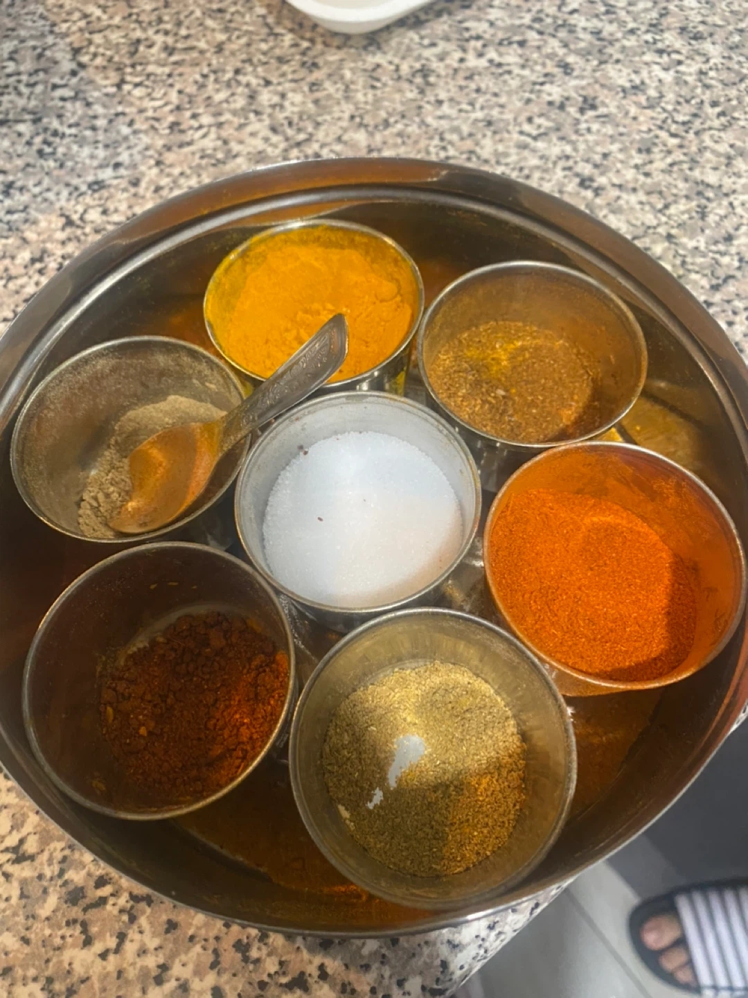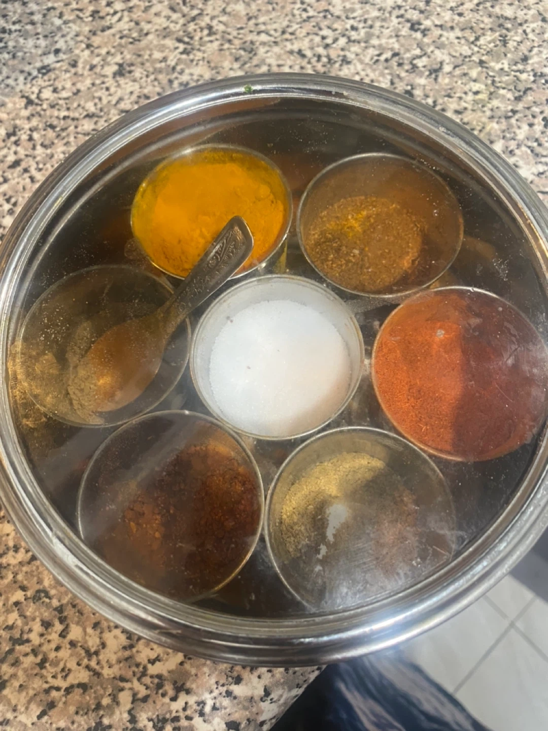 This is a classic stainless steel spice box that's perfect for organizing your favourite ground spices. It comes with seven individual compartments and a small spoon. The tight-fitting lid keeps your spices fresh! It's great for any kitchen looking to streamline their spice collection.