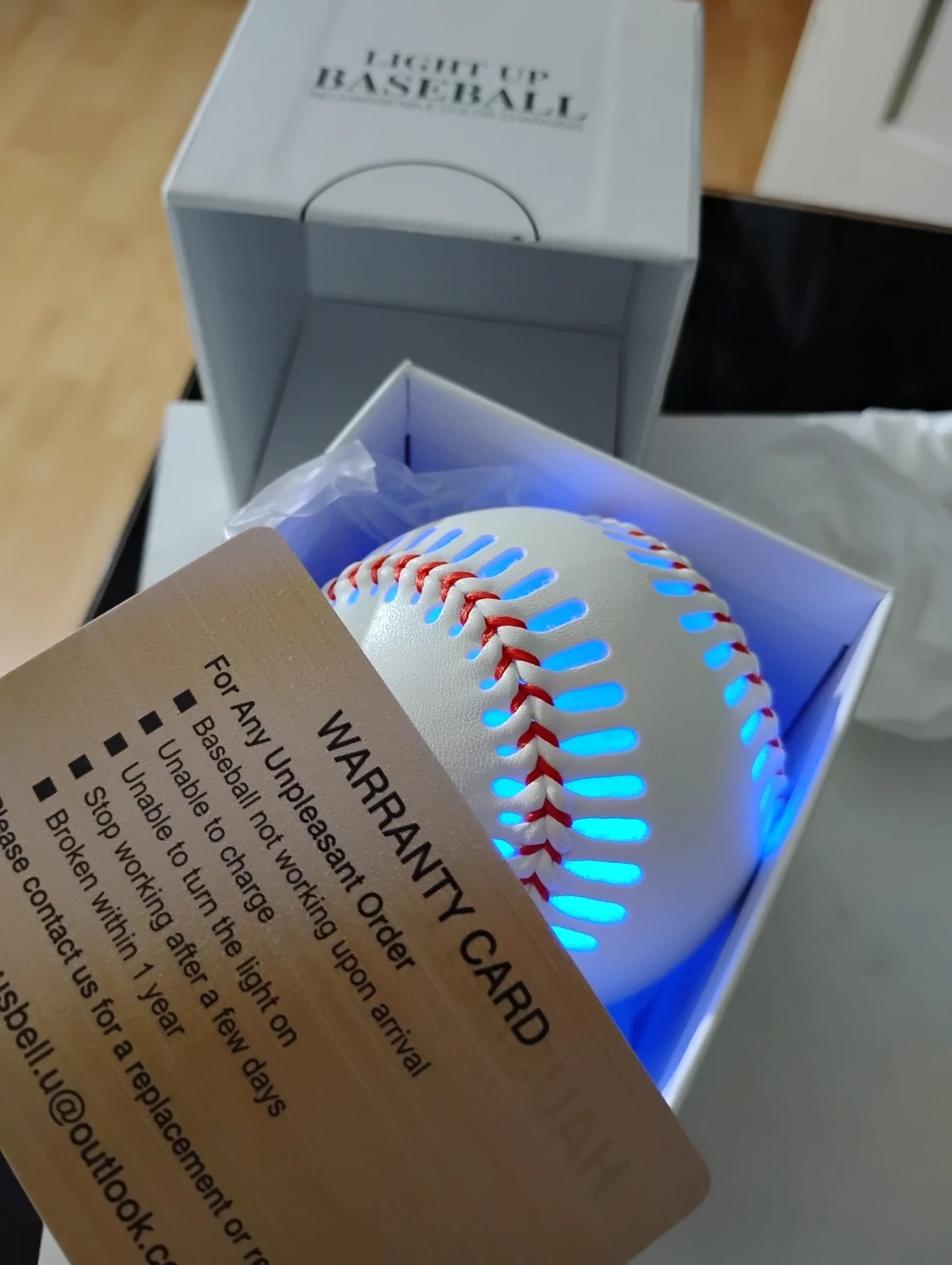 This HAUSBELL light-up baseball is rechargeable and changes colours. It's made for playing catch, not for hitting. Includes original box.
