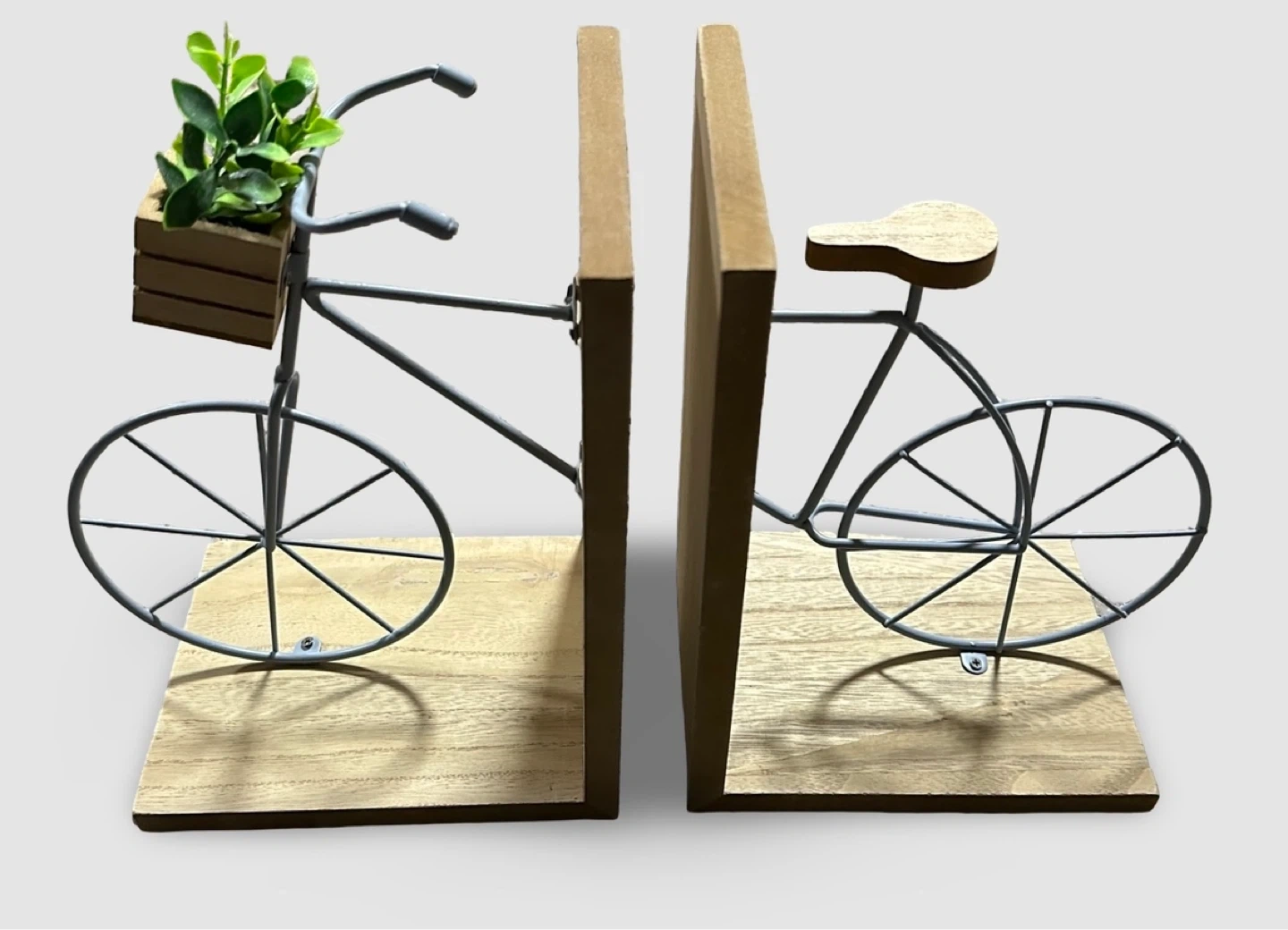 These decorative bookends feature a bicycle design with a small planter basket holding a faux green plant. They're made with a metal frame and wooden bases for stability. A unique way to hold up your books!