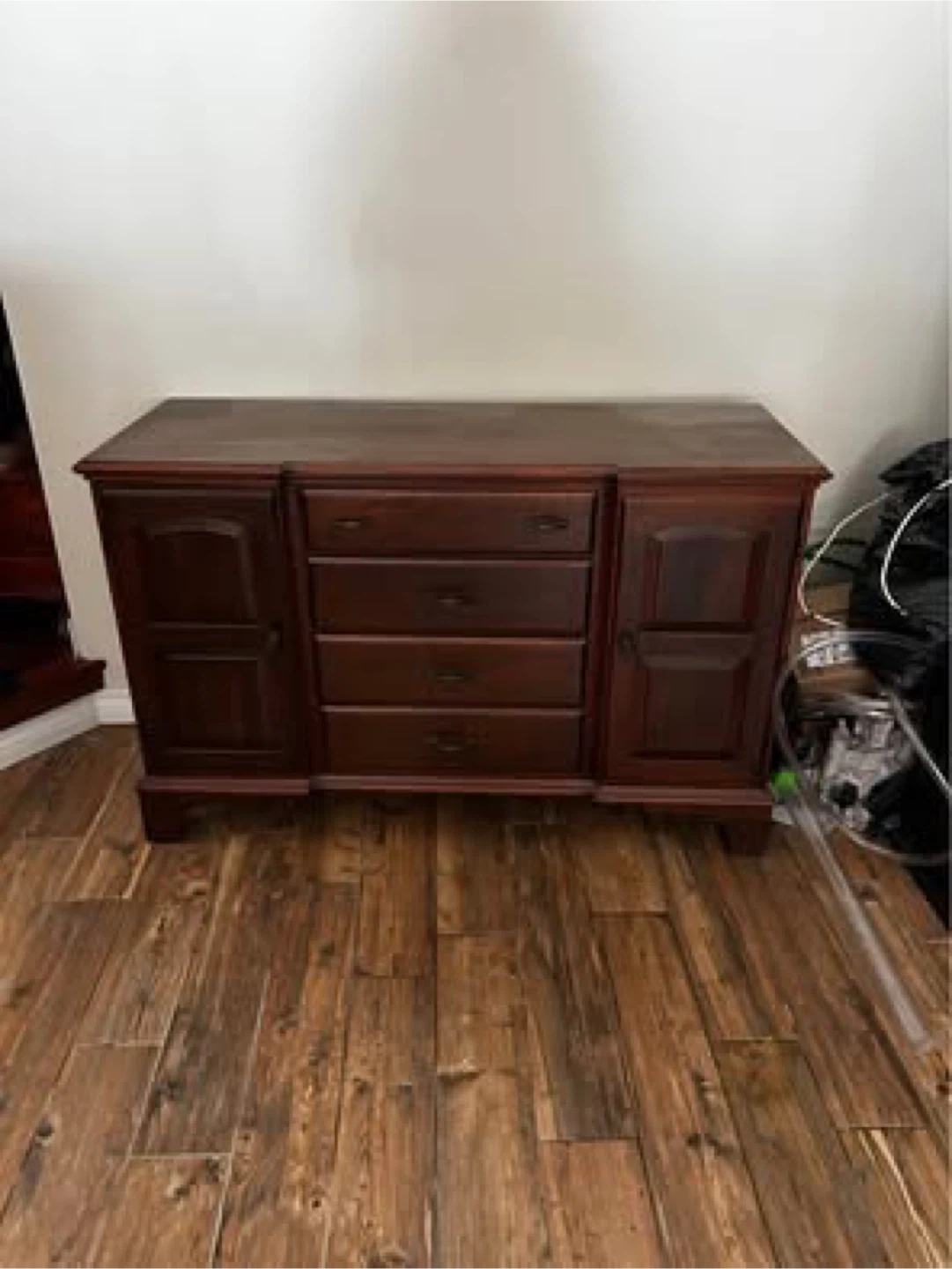 This is a solid wood sideboard or buffet with a rich, dark wood finish. It features a central bank of four drawers and two cabinets on either side, offering ample storage space. The hardware is a dark, antique-style metal. It's a sturdy piece that would be useful for dining room or living room storage.
