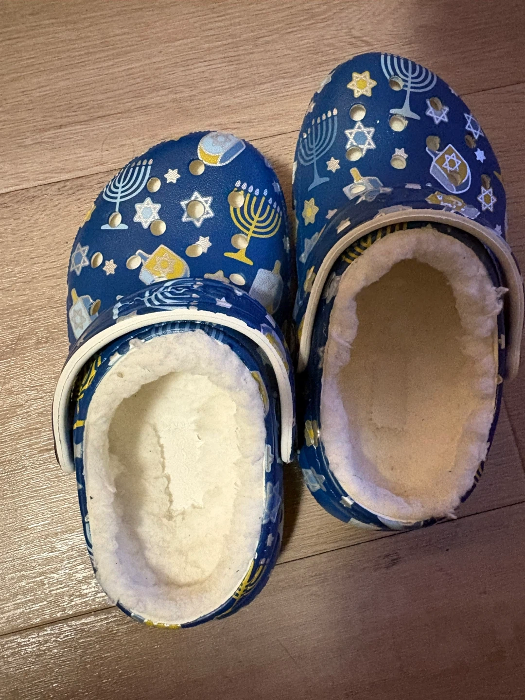 These lined Crocs feature a fun blue design with Hanukkah symbols like menorahs and Stars of David. They have a cozy sherpa-like lining for extra warmth. Perfect for keeping your feet toasty during the holiday season!