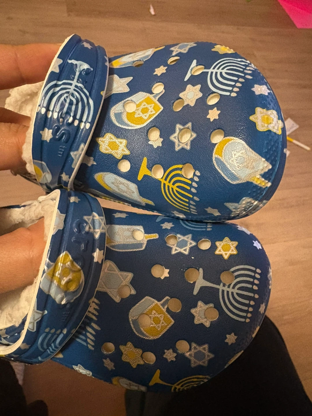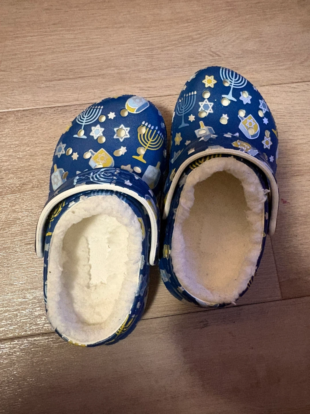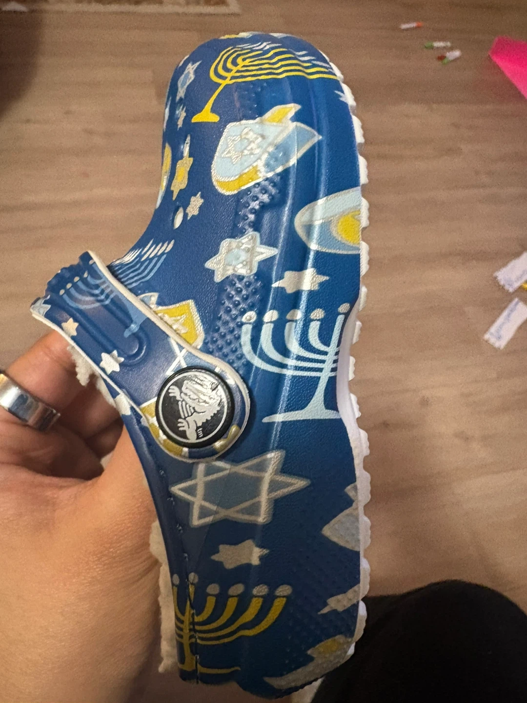 These lined Crocs feature a fun blue design with Hanukkah symbols like menorahs and Stars of David. They have a cozy sherpa-like lining for extra warmth. Perfect for keeping your feet toasty during the holiday season!
