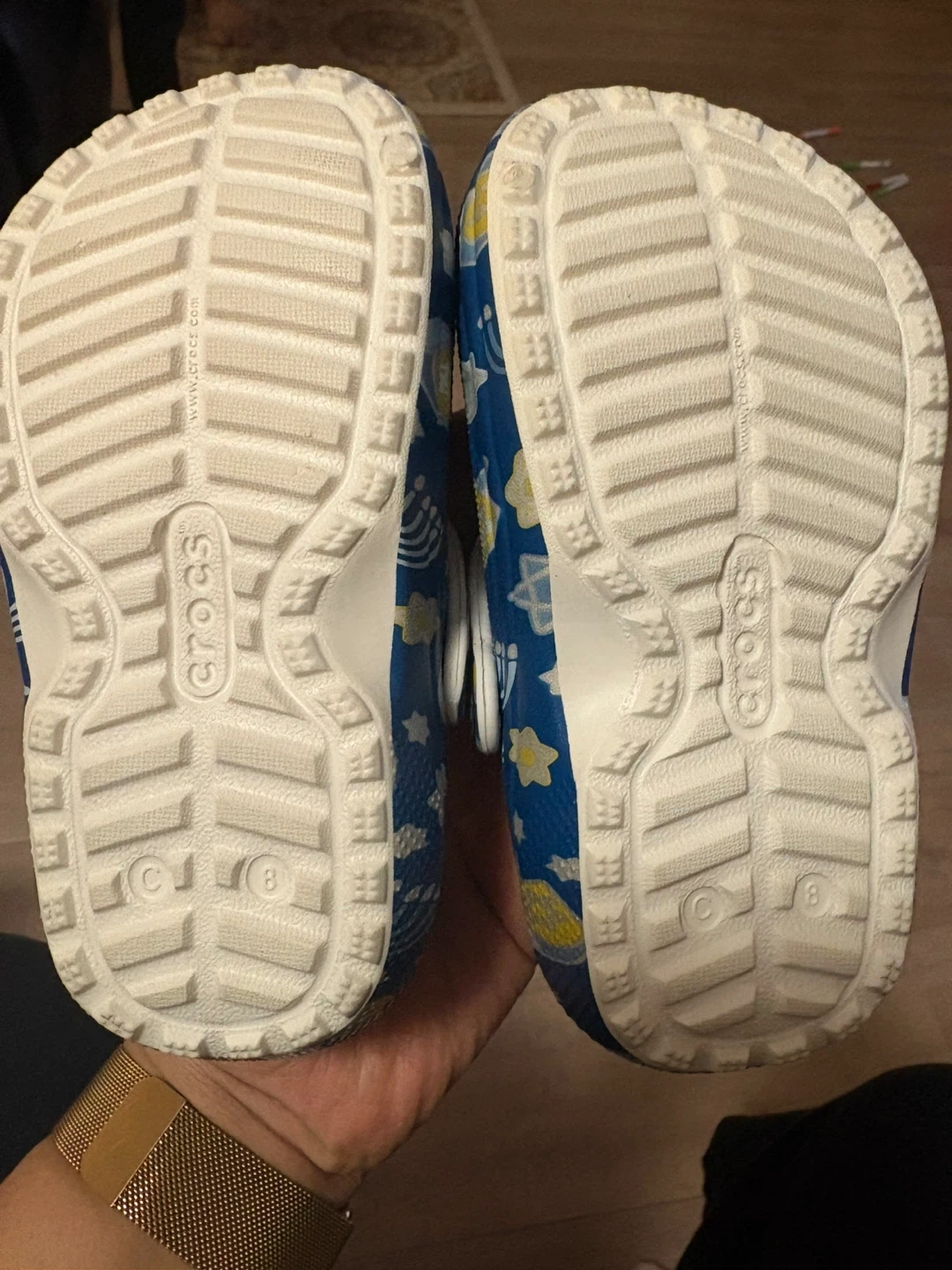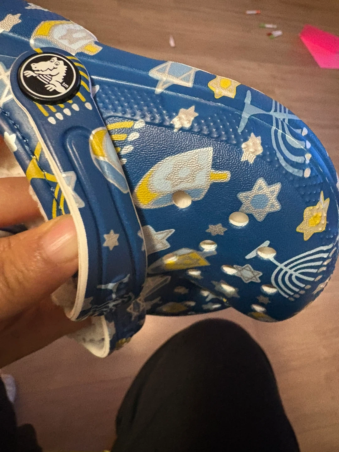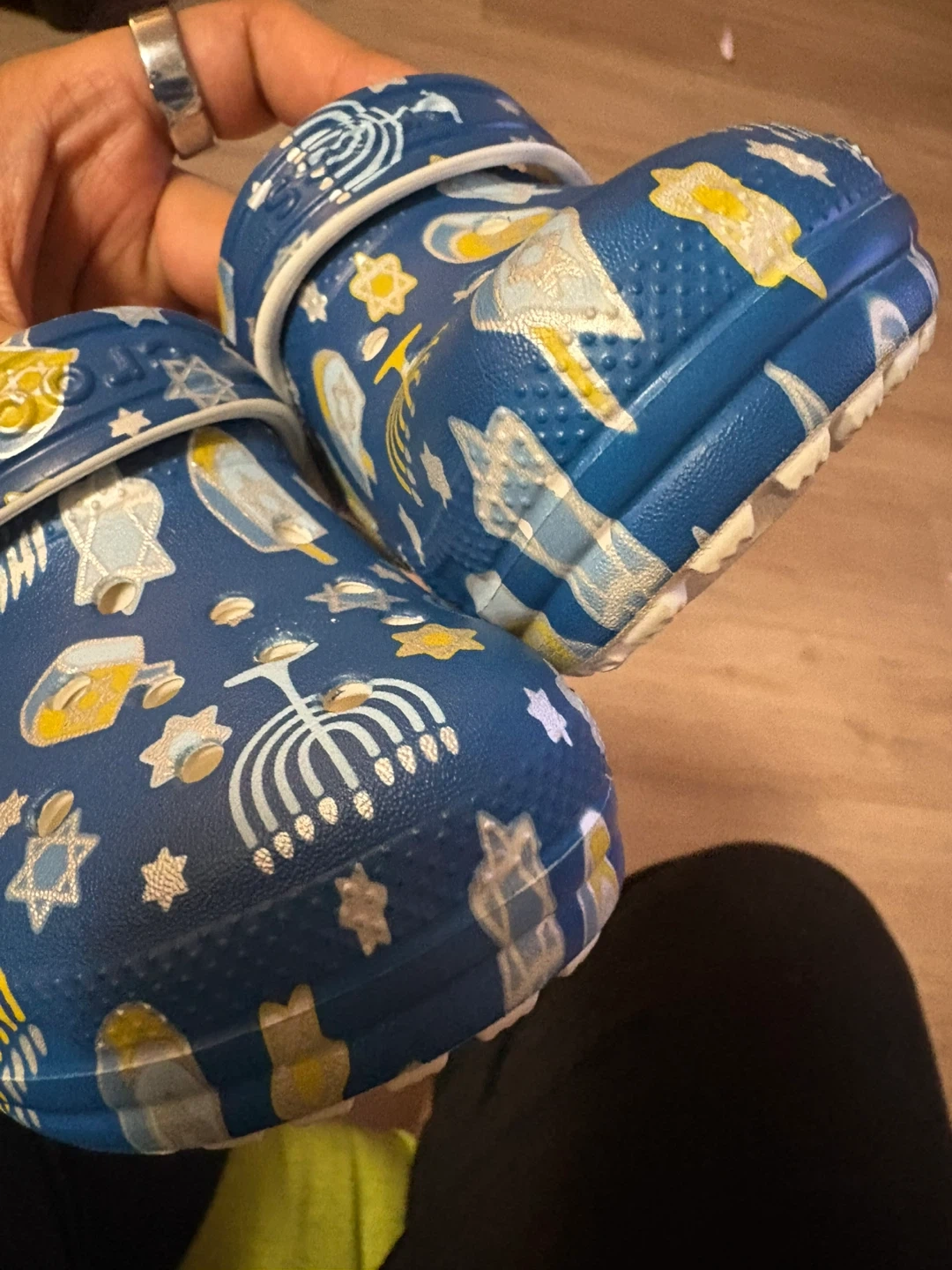 These lined Crocs feature a fun blue design with Hanukkah symbols like menorahs and Stars of David. They have a cozy sherpa-like lining for extra warmth. Perfect for keeping your feet toasty during the holiday season!