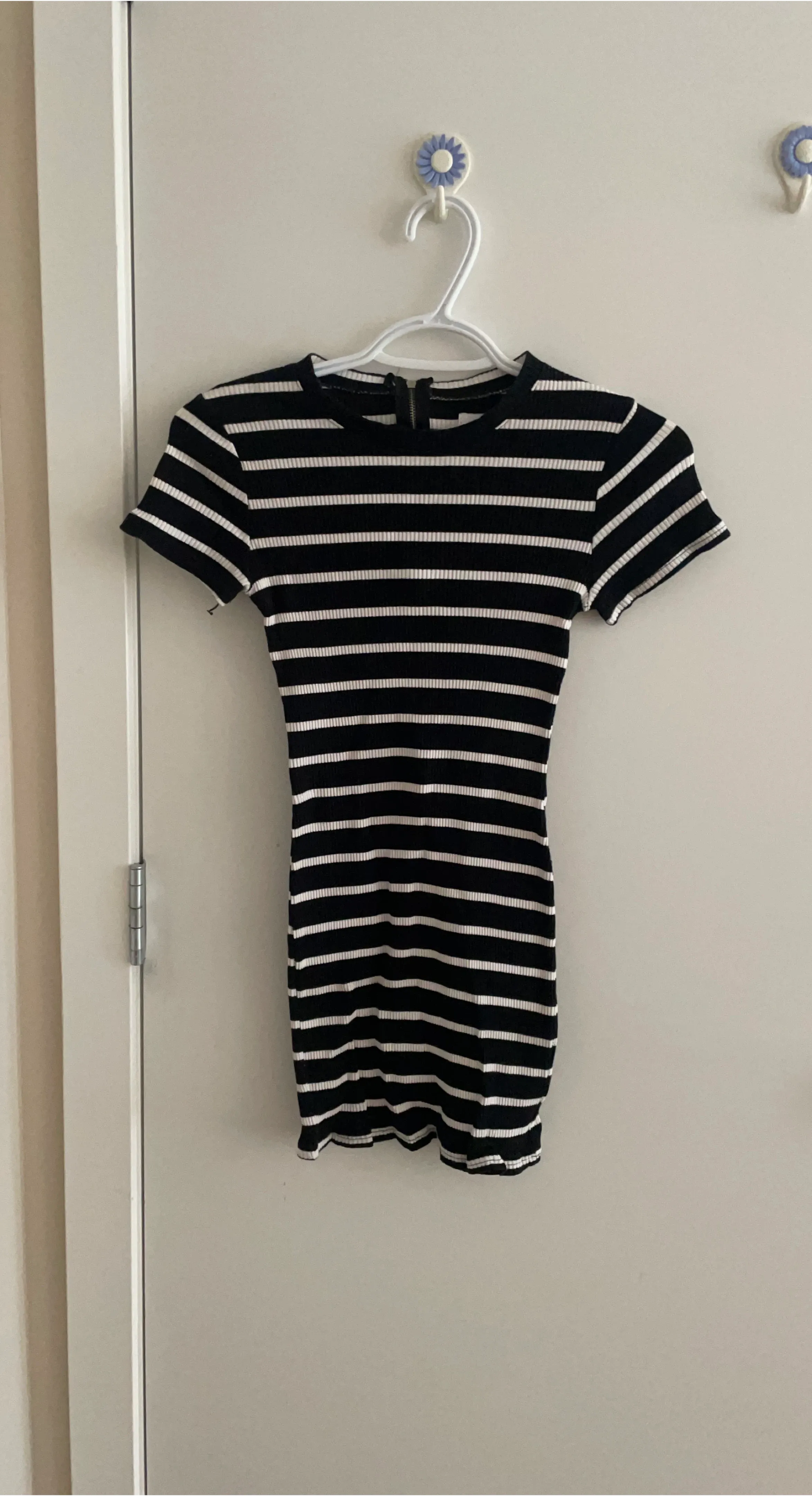 This is a short-sleeved mini dress with a black and white stripe pattern. It's made of a ribbed material and features a zipper closure at the back. It's a fitted style that would be great for casual wear or a night out!