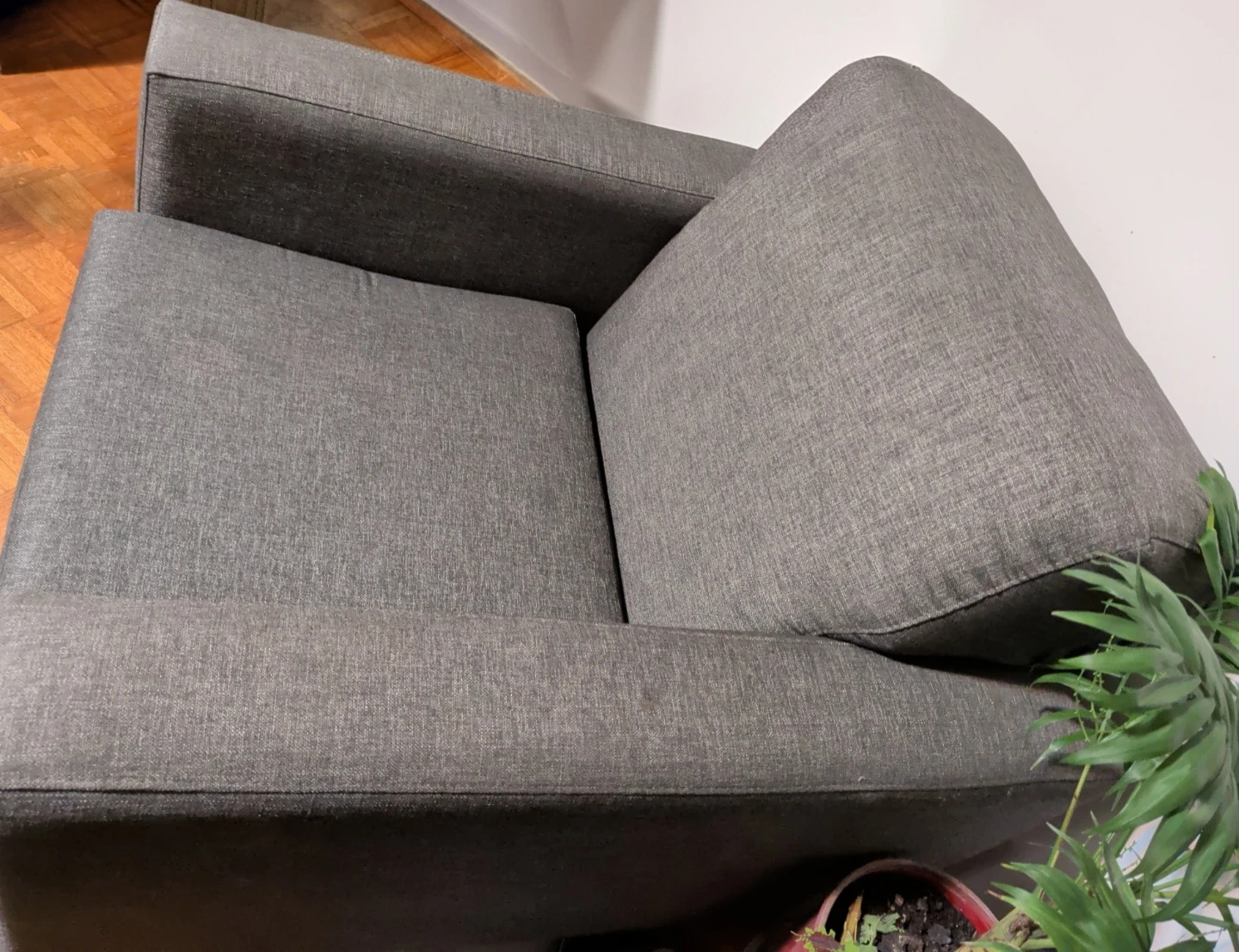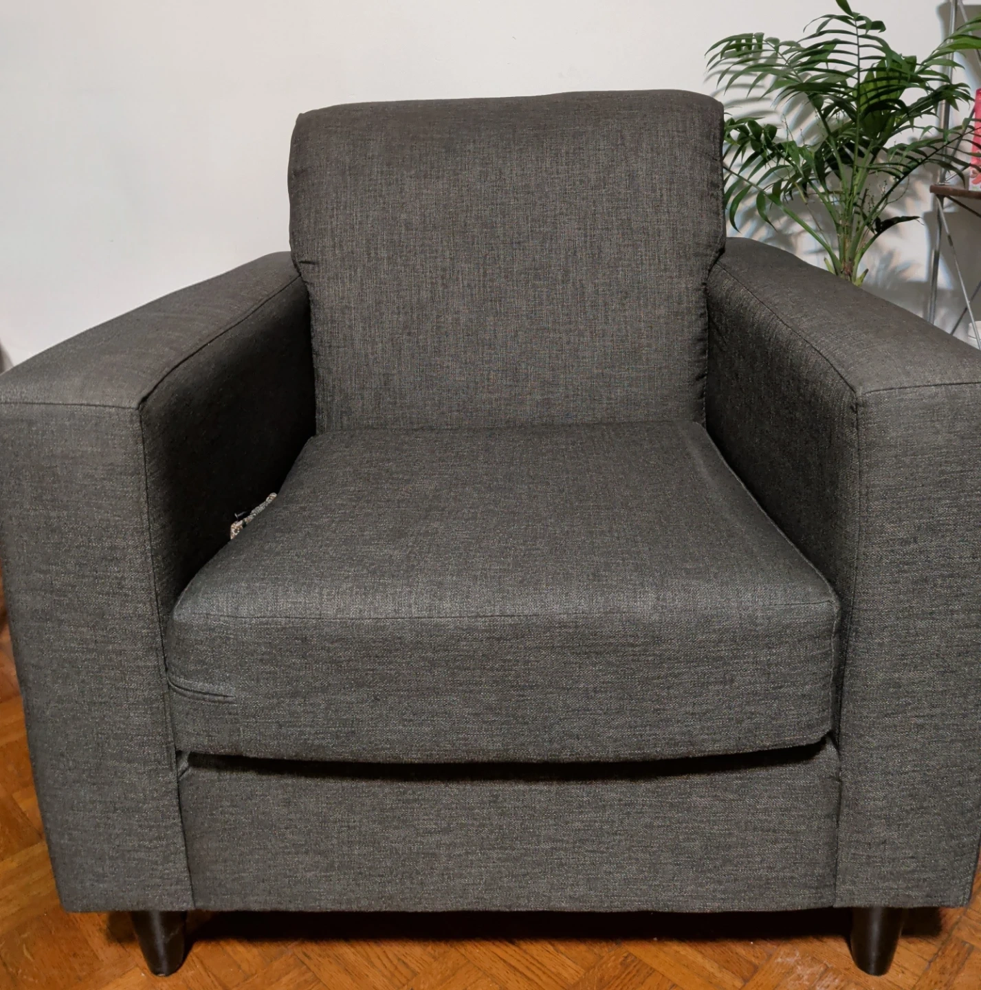 A comfy grey armchair, perfect for a small space or accent seating. It's upholstered in a durable fabric and has a modern, boxy design. Provides a nice spot to relax! Grey tone with a shiny-ish lustre. Soft but firm.