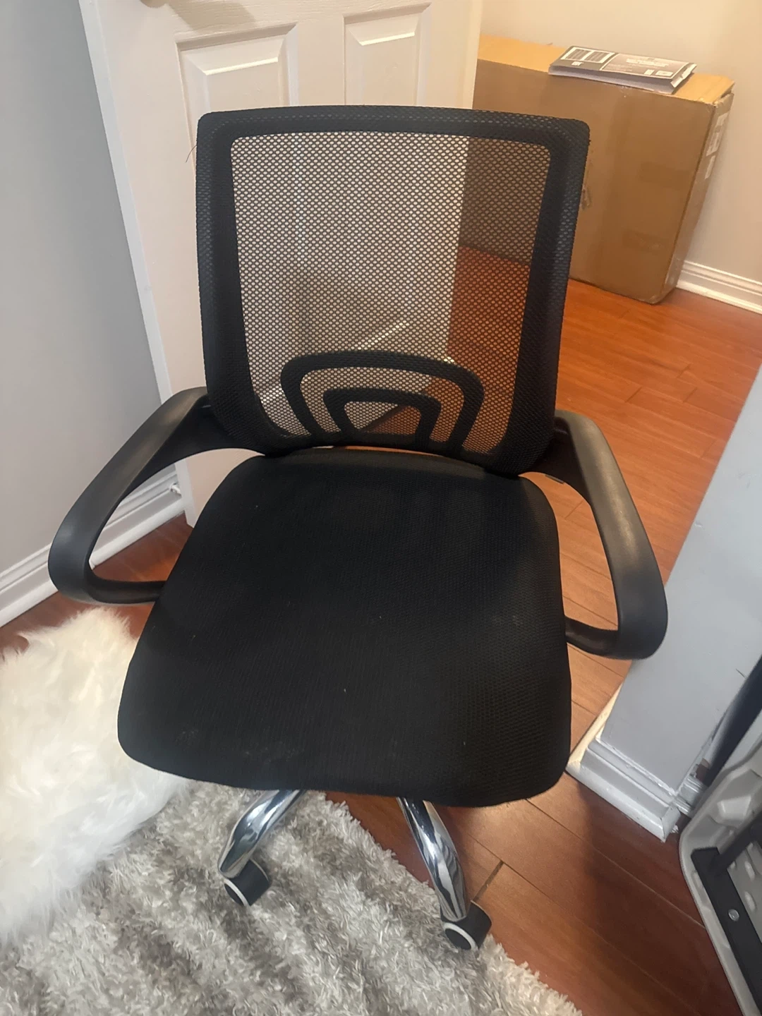 This is a black mesh office chair. It has a padded seat and mesh back for breathability. The chair features adjustable armrests and a chrome base with wheels for easy movement. It's suitable for a home office or desk setup.