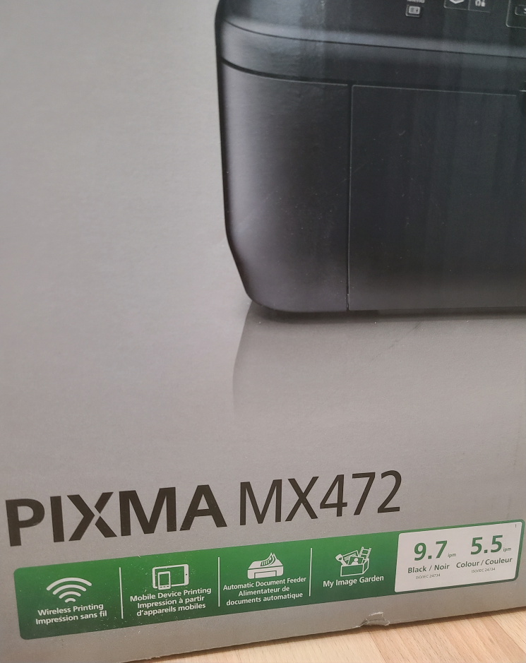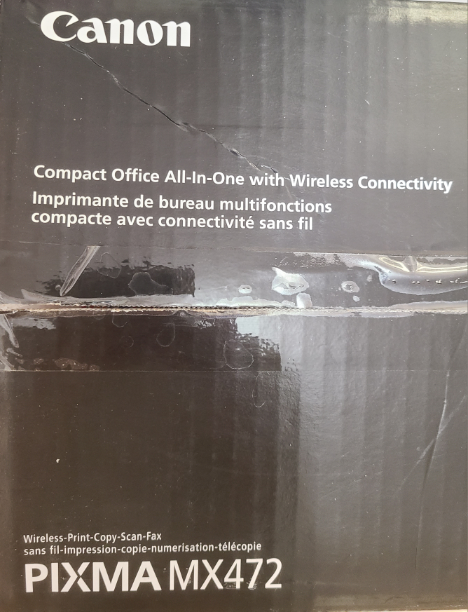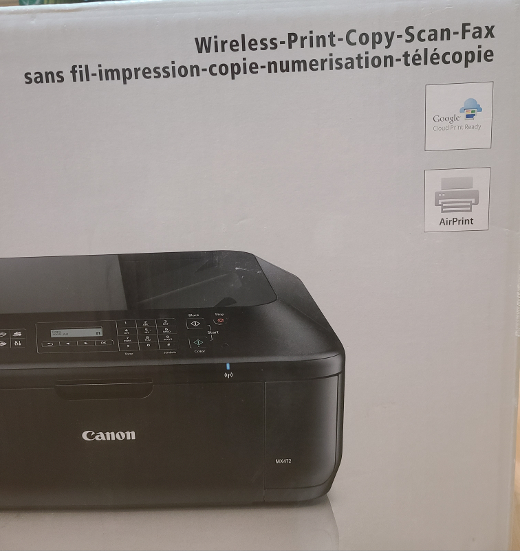 Selling a new Canon PIXMA MX472 wireless all-in-one printer still in the original packaging! It can print, copy, scan, and fax. Ink cartridge compatibility: 240 (Black) and 241 (Color)