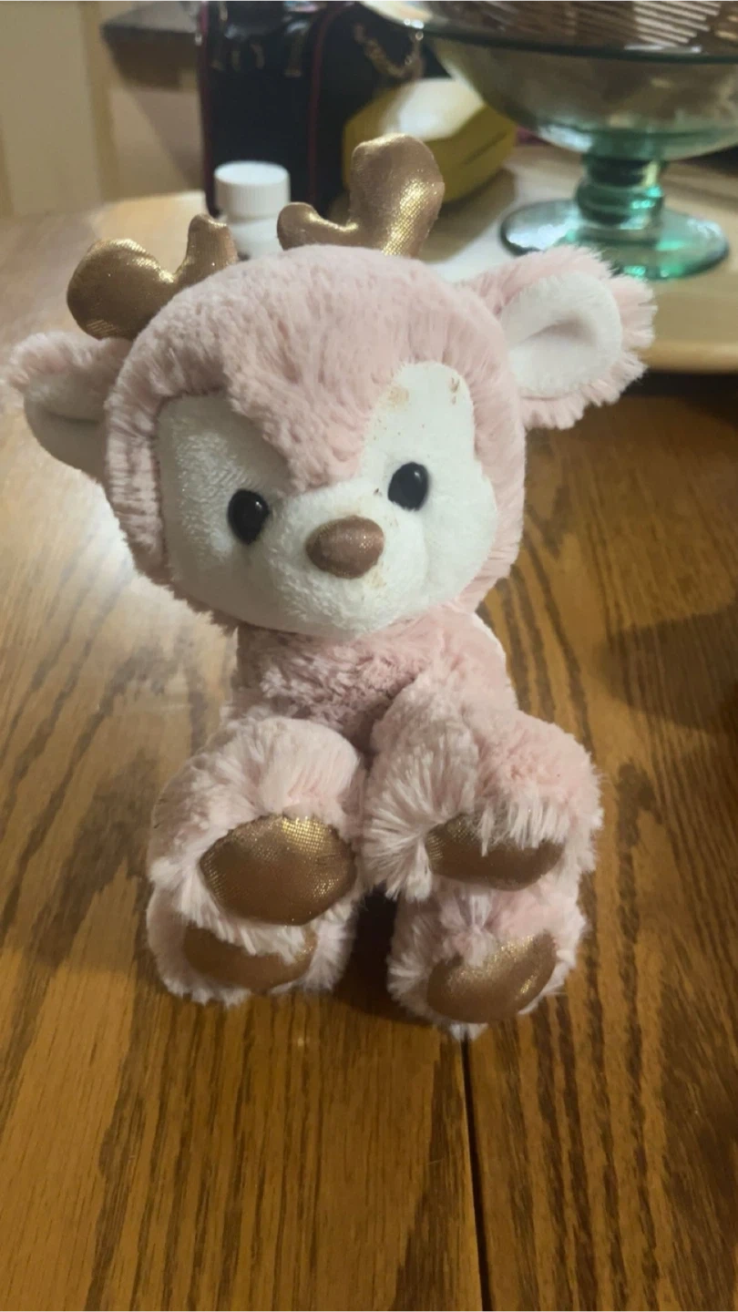 Super soft pink plush toy with gold antlers and hooves. It's a cute little reindeer with a fuzzy texture. Perfect for a little one to cuddle!