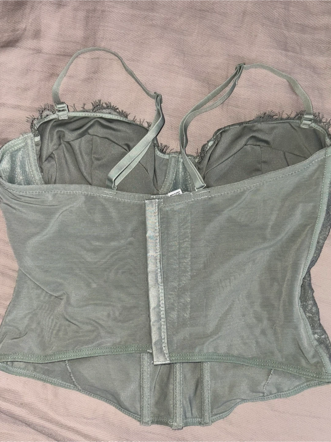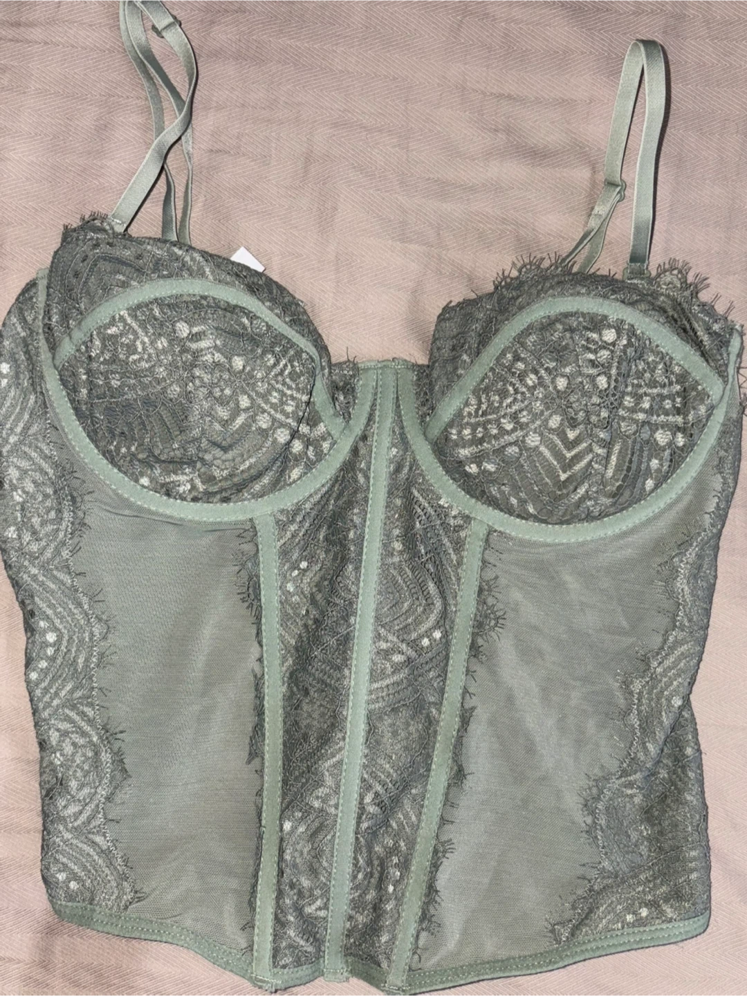 Selling a beautiful lace bustier top in a lovely shade of green. It's in great condition and ready for a new home! The delicate lace detailing adds a touch of elegance. Perfect for layering or wearing on its own