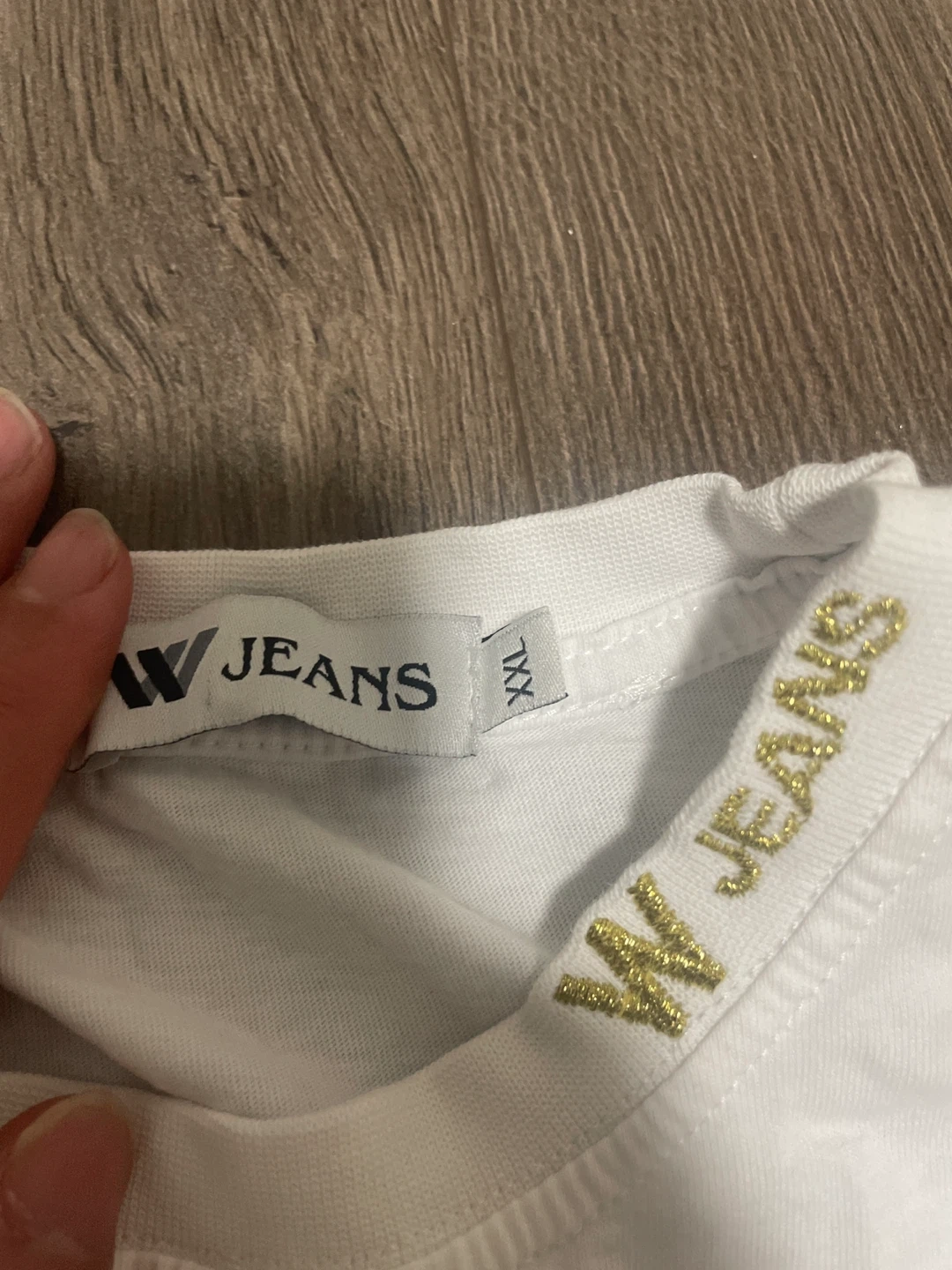 This is a white W.JEANS t-shirt in size XXL. It's made of comfortable material. The shirt has "W.JEANS" text on the front and also a gold glitter detail on the collar. It's a classic tee for casual wear.