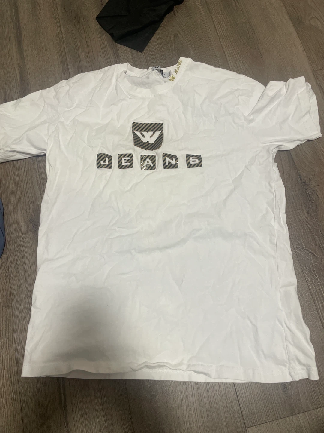 This is a white W.JEANS t-shirt in size XXL. It's made of comfortable material. The shirt has "W.JEANS" text on the front and also a gold glitter detail on the collar. It's a classic tee for casual wear.
