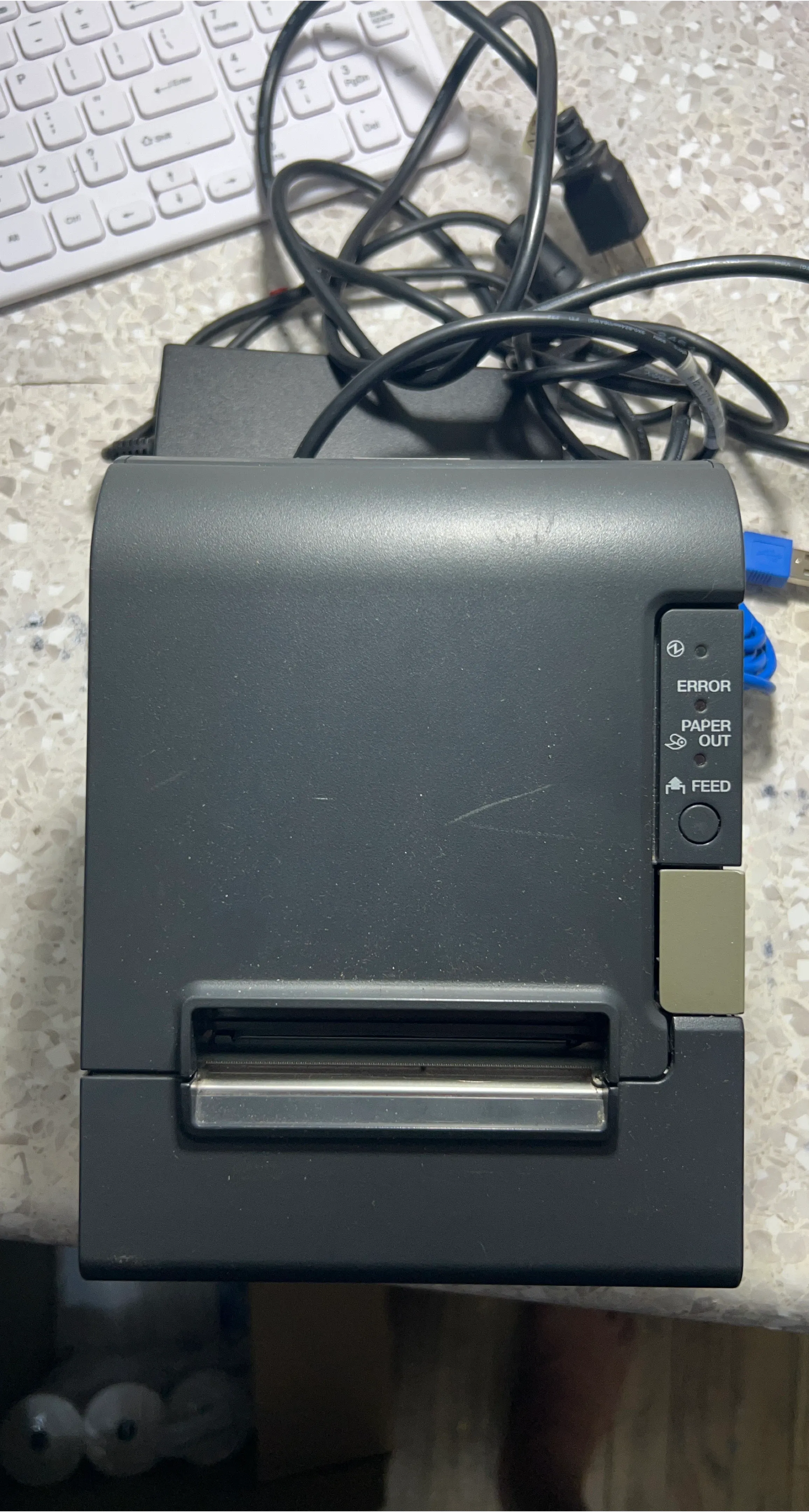 This is a thermal receipt printer, commonly used for point-of-sale systems. It includes the power adapter and a USB cable. The printer has indicator lights for Error, Paper Out, and a Feed button.