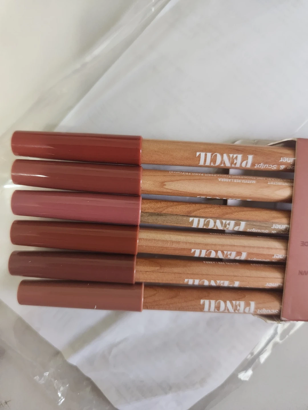 Set of 6 Face Secret lip liner pencils in various nude shades. Matte soft-focused finish. Includes shades Candy, Pink Brown, Mauve Nude, Dusty Nude, Taupe Rosy, and Warm Nude.
