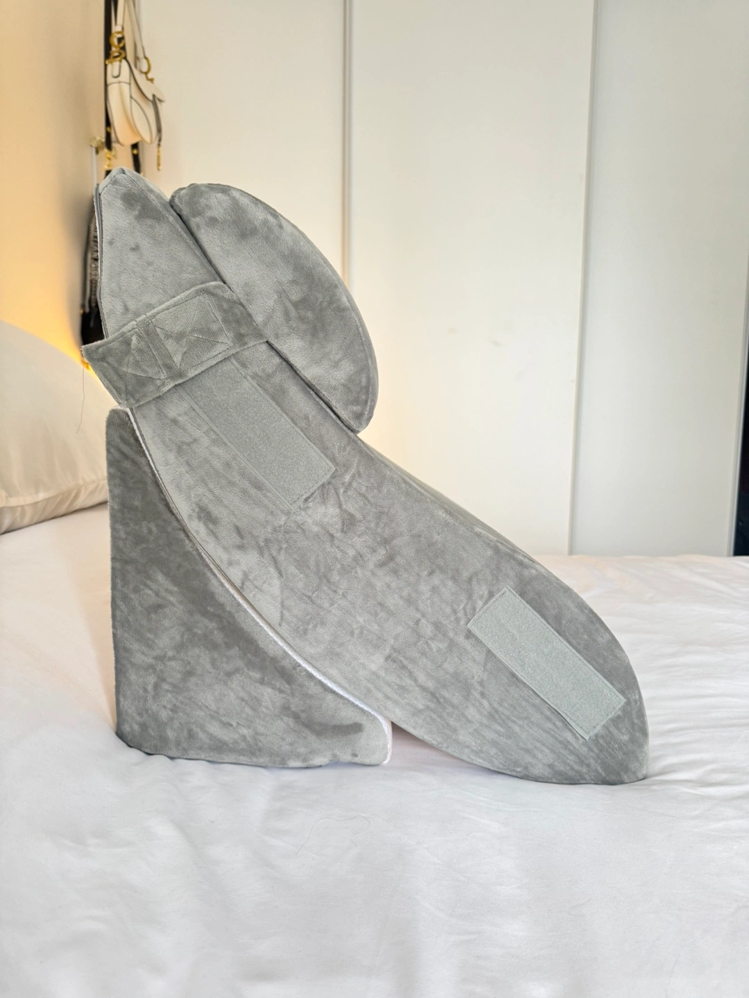Comfortable grey wedge pillow and bolster set. Soft, plush material. Great for reading in bed or elevating legs.