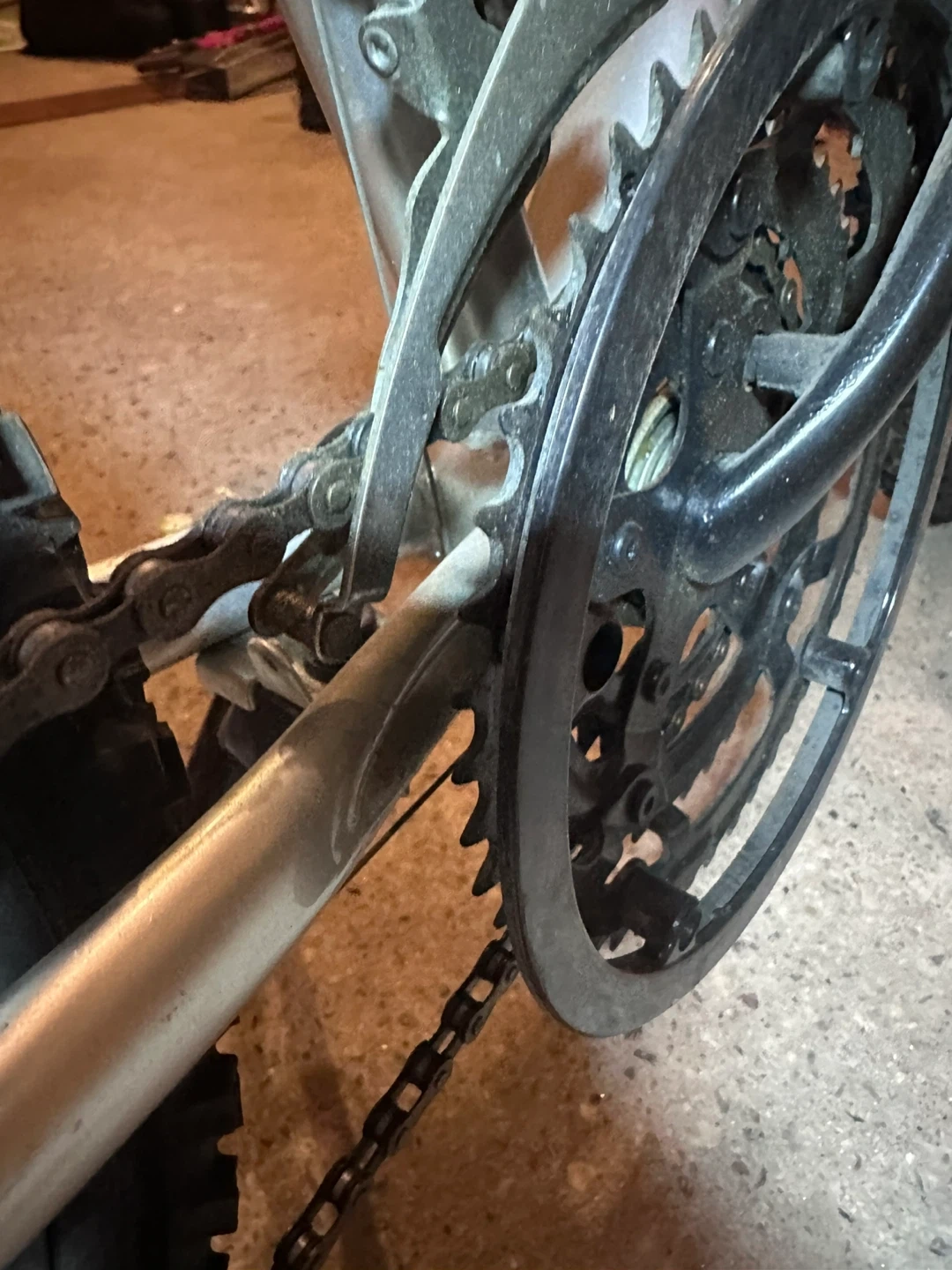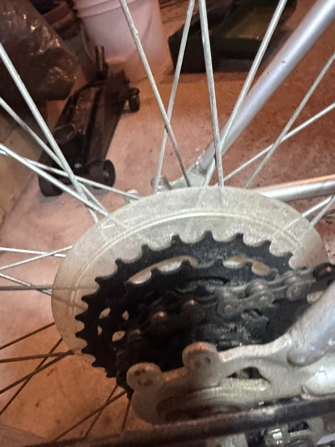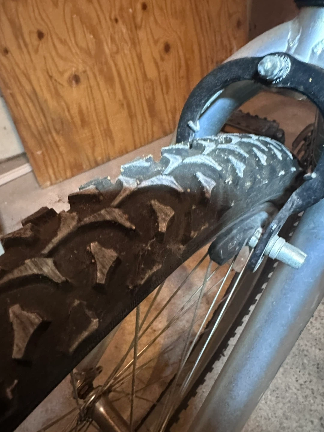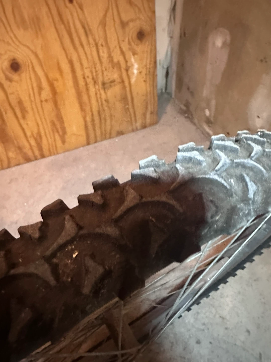 This listing includes bicycle components such as the tire, chain, and gears. The tire features an aggressive tread pattern for off-road use. It's ready for a new bike build or repair project!