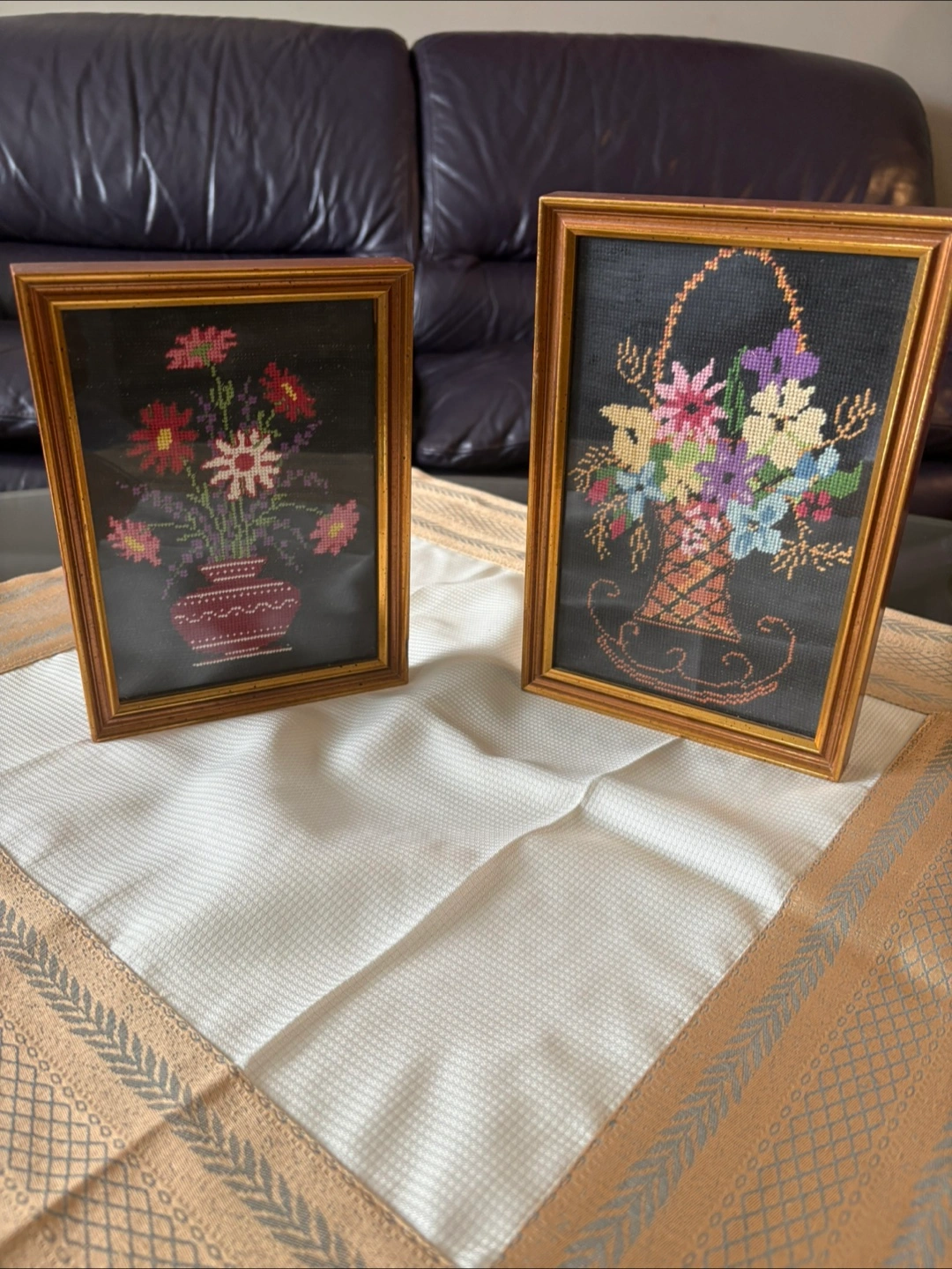 Two framed needlepoint artworks. Each piece features a unique floral design with a gold-tone frame. One is 9x6 and the other is 8x6. They are in great condition and ready to add a touch of handmade charm to your home! Pet and smoke free environment.