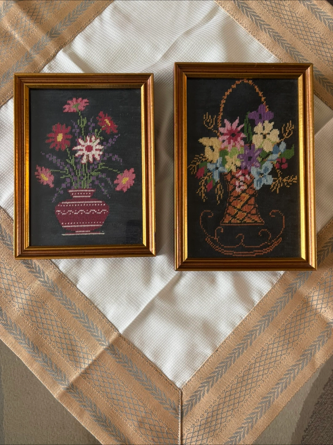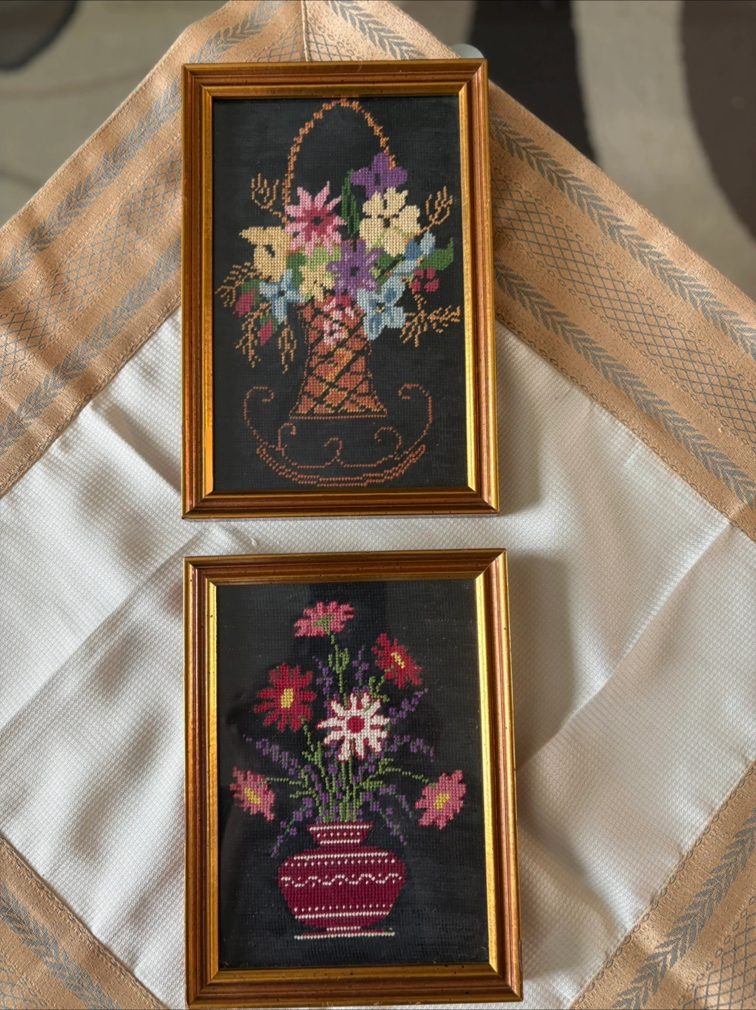 Two framed needlepoint artworks. Each piece features a unique floral design with a gold-tone frame. One is 9x6 and the other is 8x6. They are in great condition and ready to add a touch of handmade charm to your home! Pet and smoke free environment.